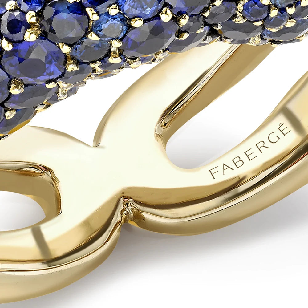 This Emotion Charmeuse Yellow Gold Blue Sapphire Ring by Fabergé showcases an oval blue sapphire center stone surrounded by over 300 round pavé-set blue sapphires, all set in 18-karat yellow gold. The bold and daring design celebrates the intense color that defines the Emotion Collection. This ring explores color as an emotional force, drawing inspiration from the Bohemian, Impressionist, and Fauvist movements, blending artistic richness with exceptional craftsmanship. A perfect expression of Fabergé's spirit.