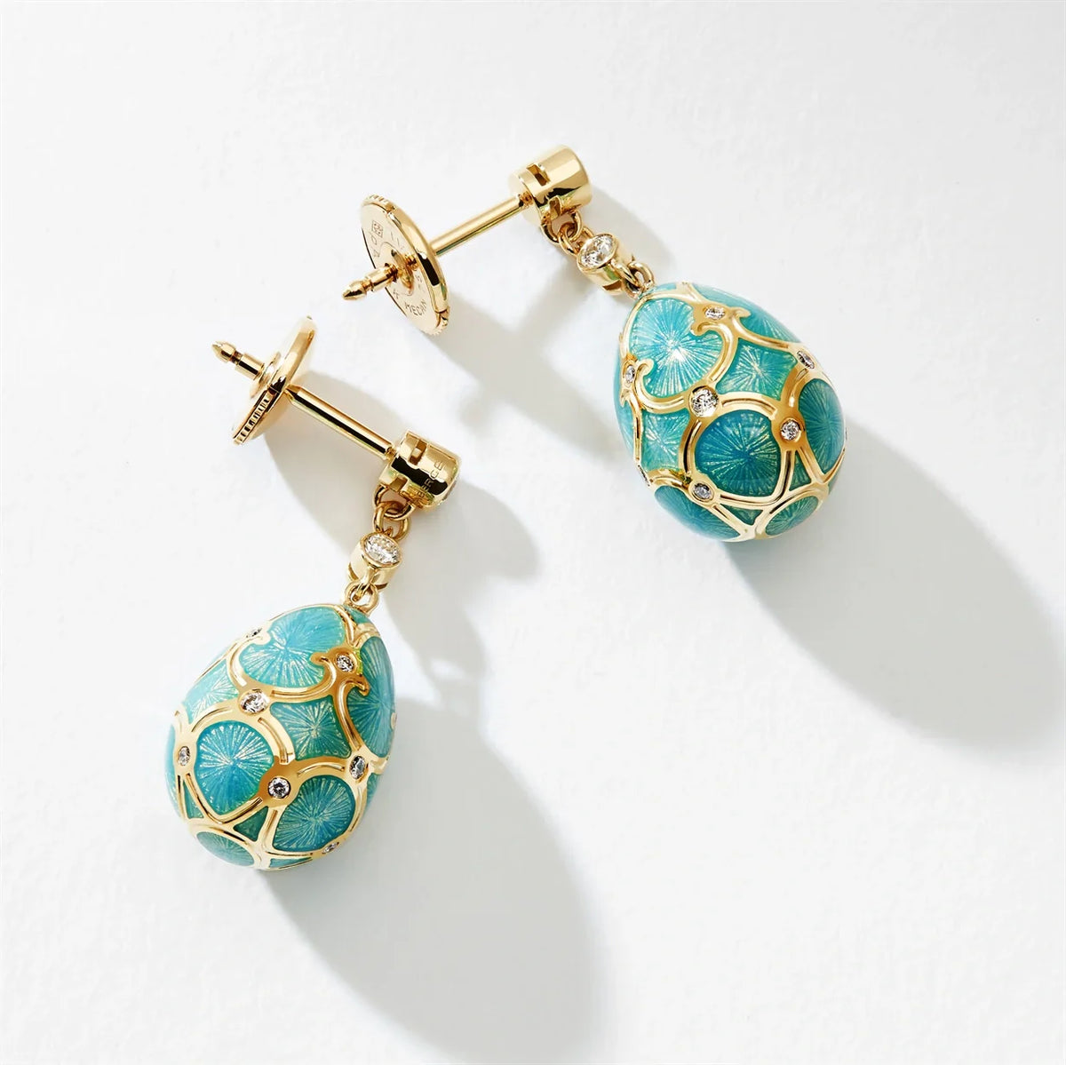 These Heritage Yellow Gold Diamond & Turquoise Guilloché Enamel Egg Drop Earrings feature turquoise guilloché enamel and round white diamonds, set in 18-karat yellow gold. With each egg measuring 14mm, these earrings represent the timeless elegance and intricate craftsmanship associated with Fabergé’s historical legacy. The combination of turquoise and diamonds creates a striking contrast, making them a perfect blend of traditional and contemporary design.