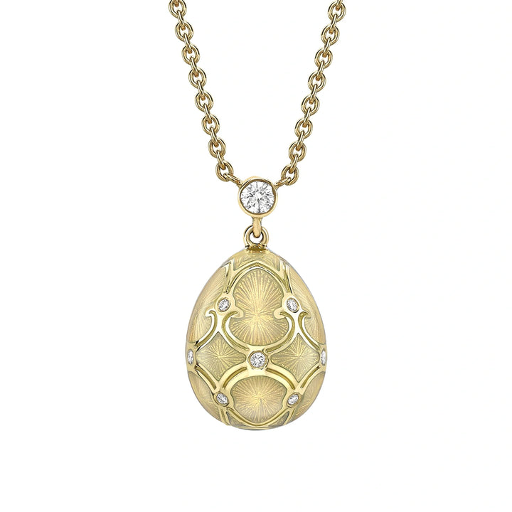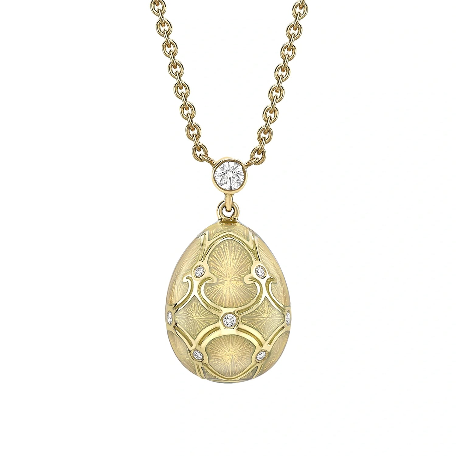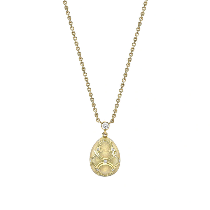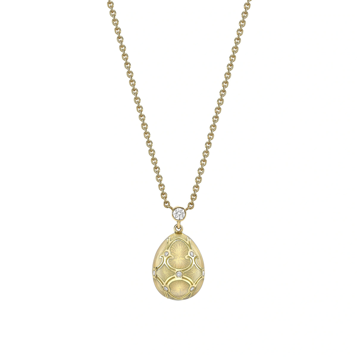 This Heritage Yellow Gold Diamond & White Guilloché Enamel Petite Egg Pendant by Fabergé features round white diamonds and opalescent guilloché enamel, set in 18-karat yellow gold. The egg-shaped pendant measures 14mm and comes with an 18-karat yellow gold chain. This piece draws inspiration from Fabergé's historical masterpieces, blending traditional craftsmanship with modern elegance, making it a timeless addition to any collection.