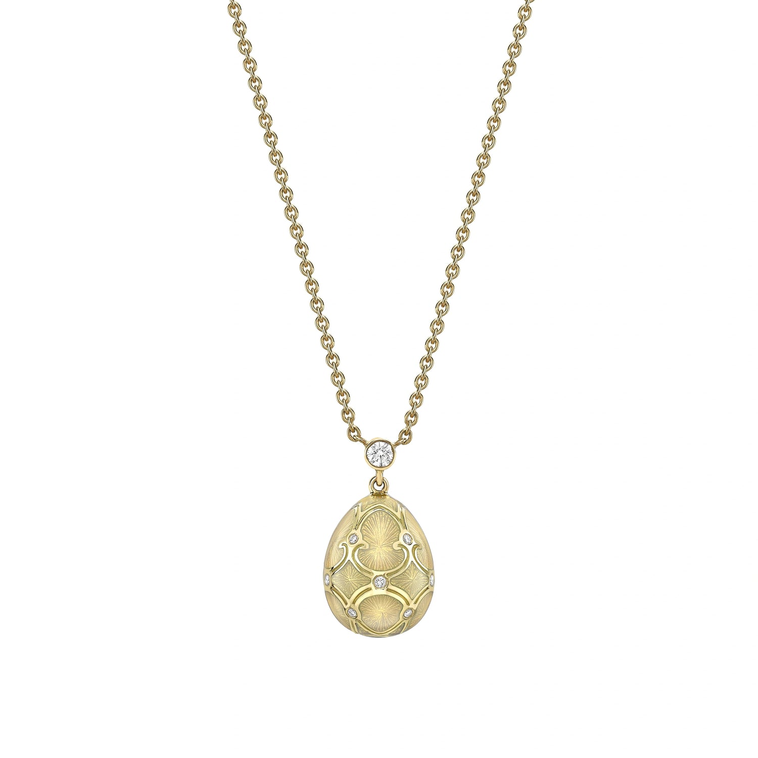 Handcrafted in 18-karat yellow gold, featuring round white diamonds and opalescent guilloché enamel. The egg pendant measures 14mm and comes with an 18-karat yellow gold chain.