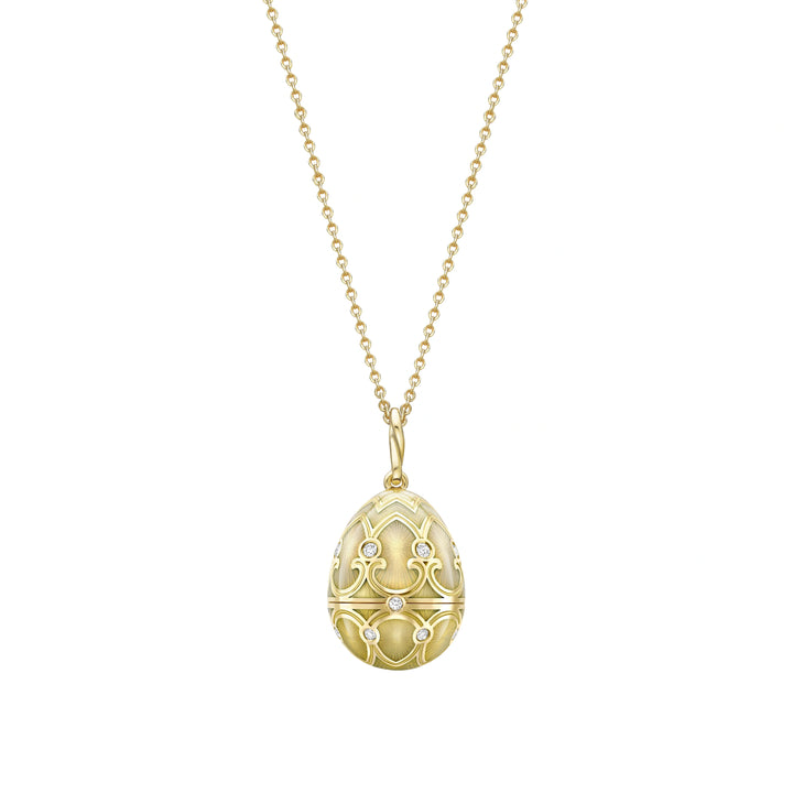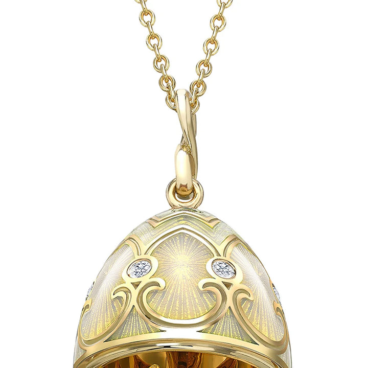 This Heritage Yellow Gold Diamond & Guilloché Enamel Hen Surprise Locket by Fabergé features round white diamonds and opalescent guilloché enamel, set in 18-karat yellow gold. The locket opens to reveal an 18-karat yellow gold hen, inspired by the famous Fabergé Imperial Hen Egg of 1885. The pendant is 22mm and comes with an 18-karat yellow gold chain. This luxurious locket represents the ingenuity of Fabergé's craftsmanship and his legacy of creating masterful surprises within his eggs.
