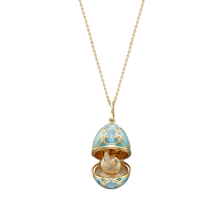 Handcrafted in 18-karat yellow gold, featuring round white diamonds and turquoise guilloché enamel. The locket opens to reveal an 18-karat yellow gold hen. The pendant is 22mm and comes with a 50cm long 18-karat yellow gold chain.