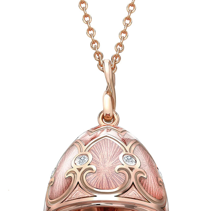Handcrafted in 18-karat rose gold, featuring round white diamonds and opalescent pink guilloché enamel. The locket opens to reveal an 18-karat rose gold hen. The locket measures 22mm and comes with a 50cm long 18-karat rose gold chain.