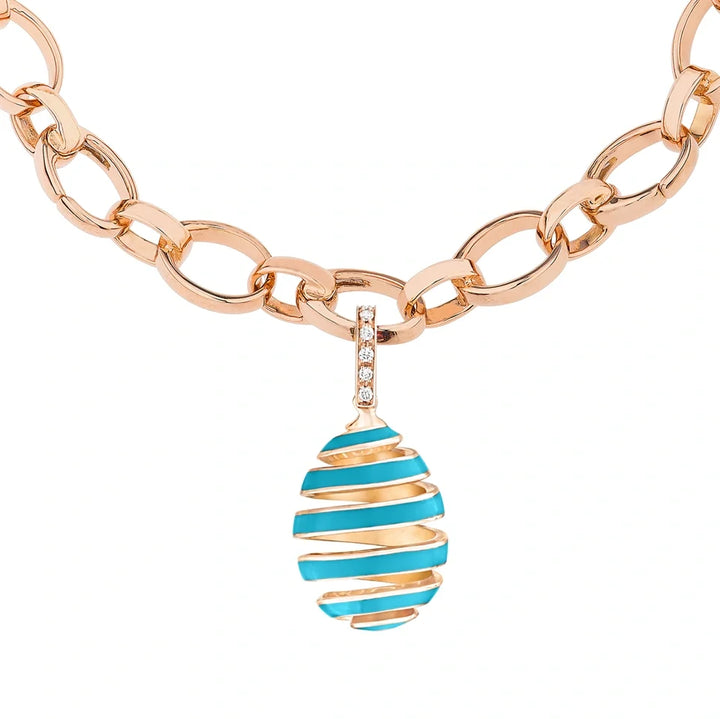 This Fabergé Essence Rose Gold, Diamond & Blue Enamel Spiral Egg Charm by Fabergé showcases the perfect balance of vibrant color and luxurious sparkle. Featuring round white diamonds and blue cold enamel, set in 18-karat rose gold, this charm draws inspiration from the classic Rocaille Egg, embodying the elegant style of the Rococo era. The rich blue enamel contrasts beautifully with the diamonds, offering a striking and meaningful addition to any collection.