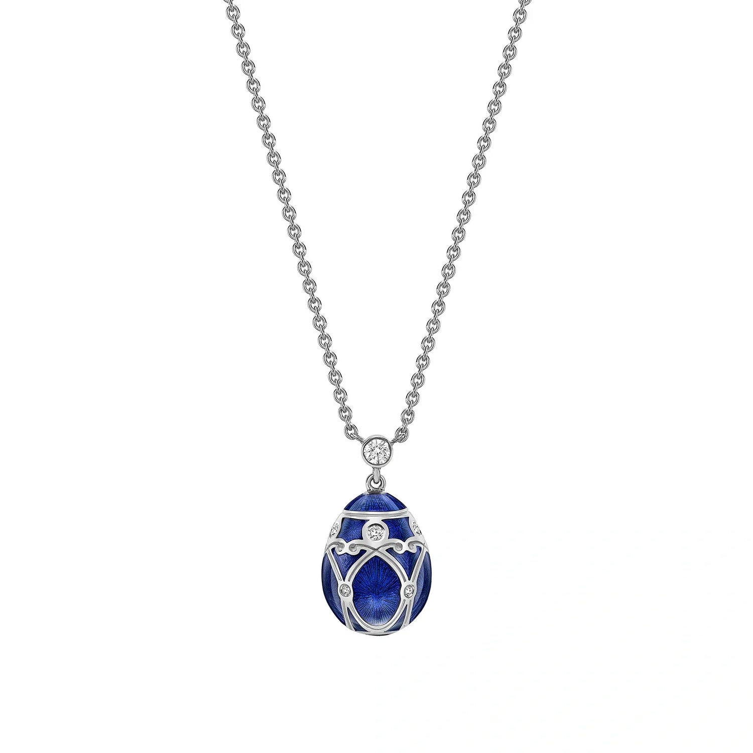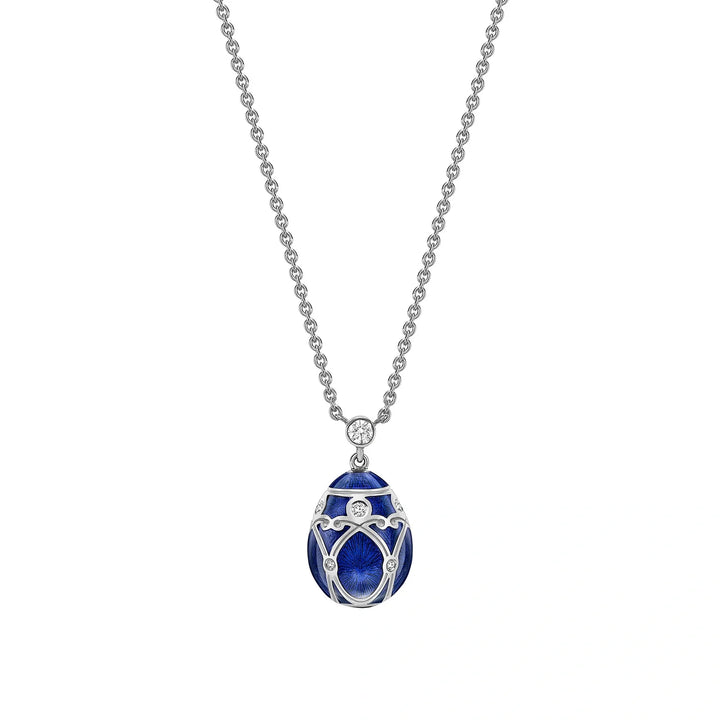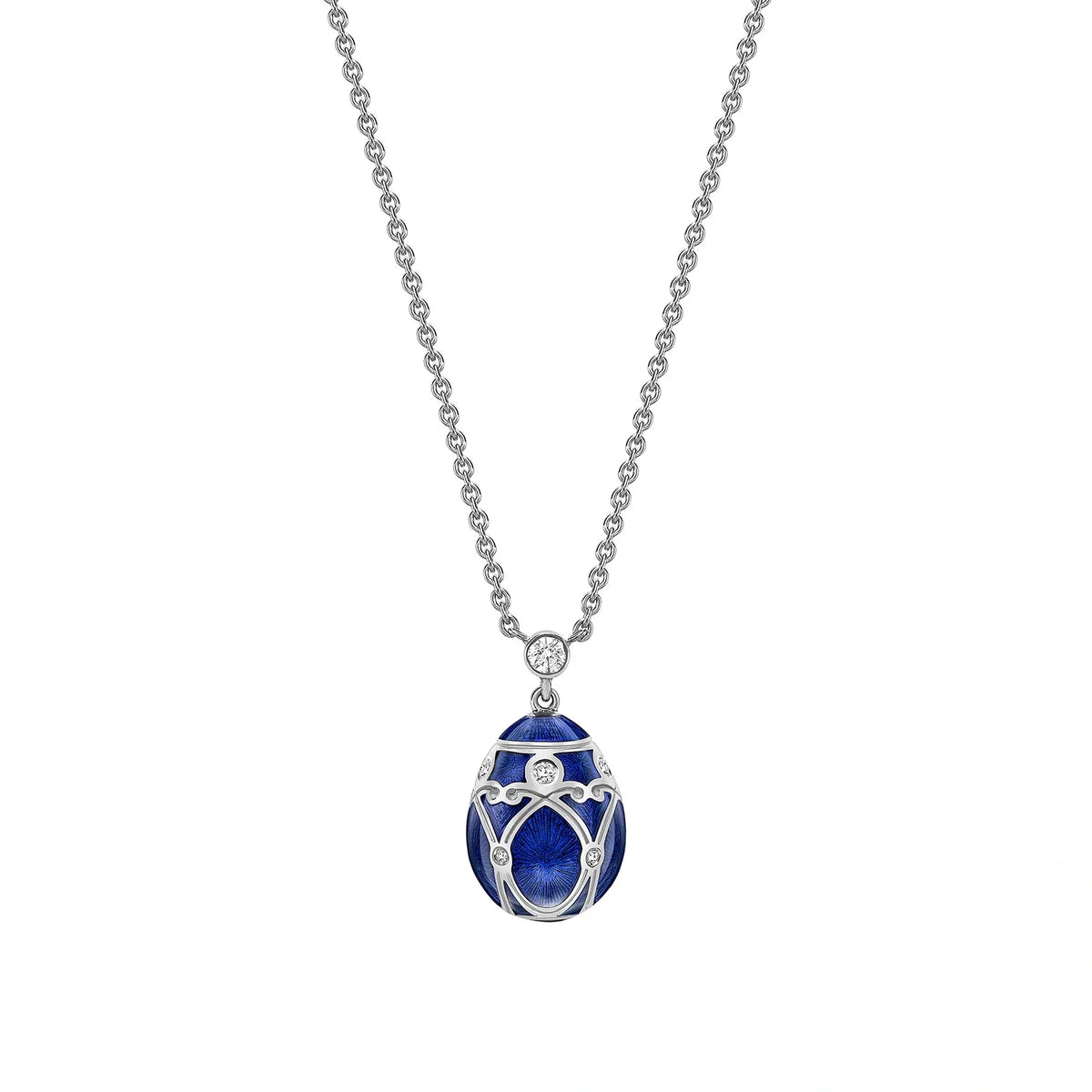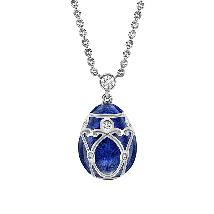 This Heritage Palais White Gold Diamond & Royal Blue Guilloché Enamel Petite Egg Pendant is a refined and elegant piece that embodies Fabergé’s legacy of craftsmanship. The pendant features blue guilloché enamel and round white diamonds, set in 18-karat white gold, offering a striking contrast between the deep blue enamel and the sparkle of the diamonds. Inspired by Fabergé’s historical masterpieces, this piece reflects the intricate techniques of guilloché enameling and hand-engraving, offering a rich and timeless design.