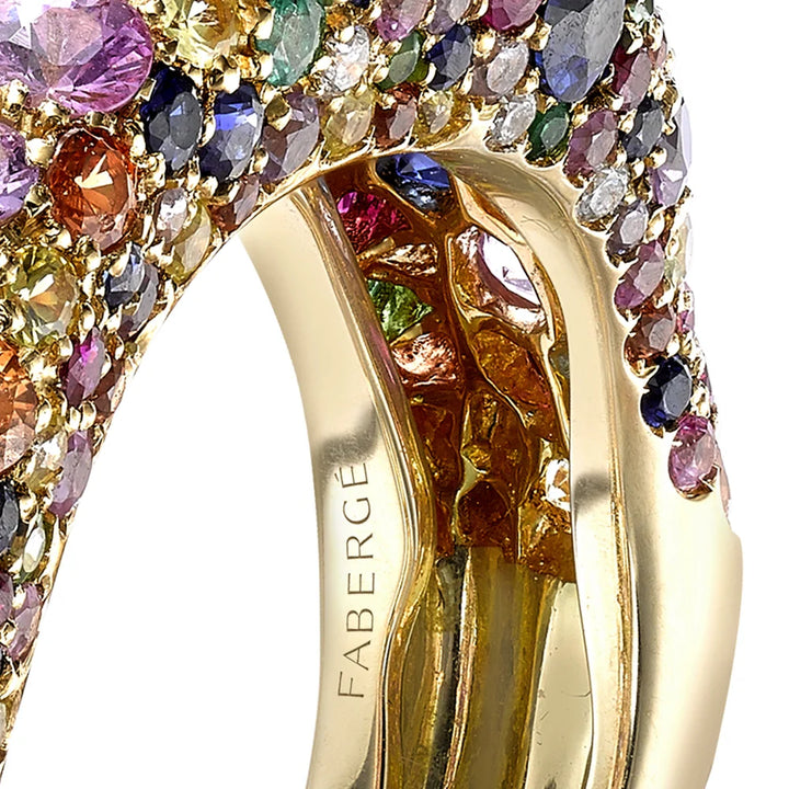 This Emotion Yellow Gold Multicoloured Gemstone Petite Ring by Fabergé is a bold and captivating piece that embodies the rich, vibrant spirit of the Emotion Collection. Featuring multi-colored sapphires, rubies, tsavorites, and white diamonds, set in 18-karat yellow gold, this ring explores the emotional power of color. Drawing inspiration from Bohemian, Impressionist, and Fauvist movements, this ring evokes feeling and expression through its vivid gemstones. A true statement of artistic richness and craftsmanship, it serves as a reminder of the emotional impact color can have.