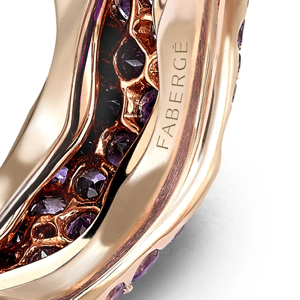 This Emotion Rose Gold Amethyst Grand Ring by Fabergé is an expressive masterpiece. Dozens of striking purple amethysts cover the surface of the ring, creating a bold, dramatic look. Part of the Emotion Collection, this ring explores the intellectual and artistic richness of color, inspired by Bohemian, Impressionist, and Fauvist interpretations of vivid hues as an emotional force. The stunning use of amethysts evokes creativity and passion, making this piece a true statement of individuality and craftsmanship.