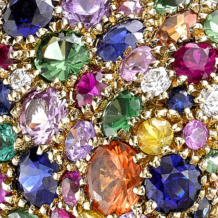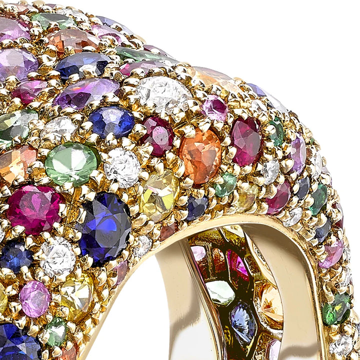 Handcrafted in 18-karat yellow gold with multicolored sapphires, white diamonds, rubies, tsavorites, and emeralds. Ring measures 2.4cm in outside width and 1.7cm inside width.