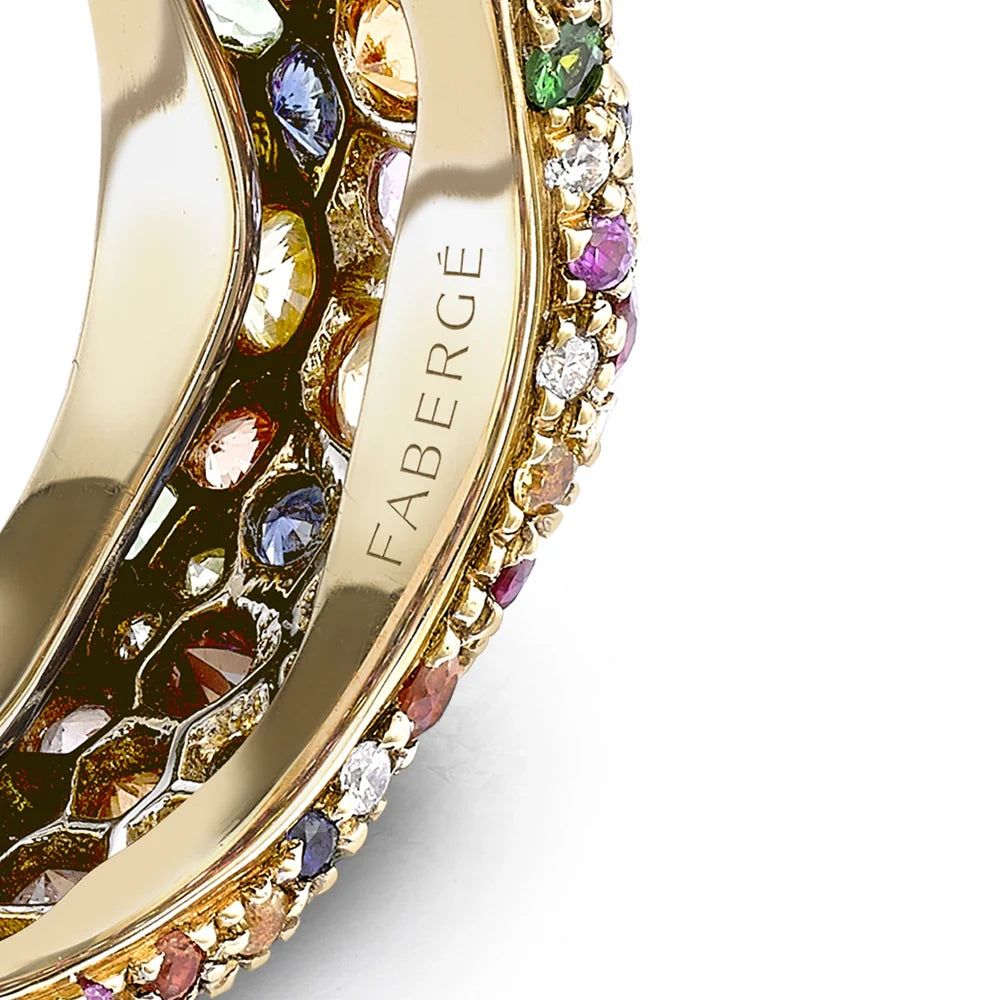 This Emotion Yellow Gold Multicoloured Gemstone Grand Ring by Fabergé is a captivating and bold expression of color. Featuring multicolored sapphires, white diamonds, rubies, tsavorites, and emeralds, all set in 18-karat yellow gold, this ring celebrates vivid color as an emotional force. With an outside width of 2.4 cm and an inside width of 1.7 cm, the ring makes a striking impact while embodying the bold spirit of the Emotion Collection. A true statement piece, it pushes the boundaries of design and craftsmanship.