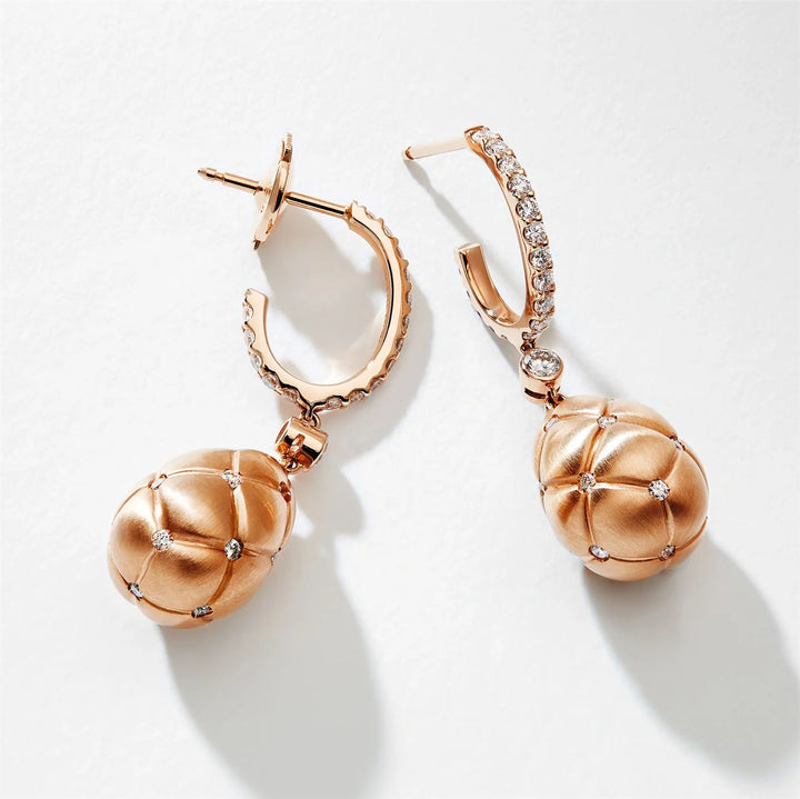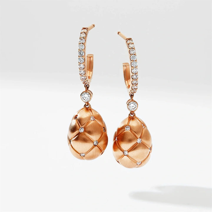 These Treillage Brushed Rose Gold & Diamond Set Egg Drop Earrings are a striking mix of heritage and modernity, with round white diamonds set in 18-karat brushed rose gold. The 14mm egg shape draws inspiration from Fabergé’s iconic Diamond Trellis Egg, with soft, tactile, and gem-set quilting that creates a unique texture. The combination of brushed rose gold and diamonds offers a modern yet classic elegance, making these earrings a luxurious addition to any jewelry collection.