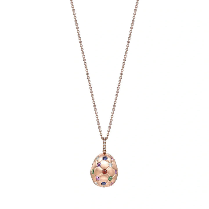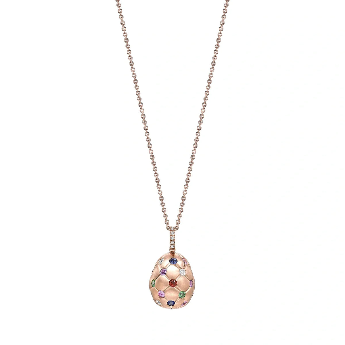 The Treillage Multi-coloured Rose Gold Pendant is a vibrant and luxurious piece, showcasing a stunning array of gemstones including rubies, amethysts, sapphires, tsavorites, and fire opals, set in 18-karat brushed rose gold. The egg-shaped pendant, measuring 18mm, is a masterpiece inspired by Fabergé’s Diamond Trellis Egg from 1892. The piece embodies a perfect blend of heritage and modernity, with its intricate gem-set quilting adding a tactile and artistic dimension.