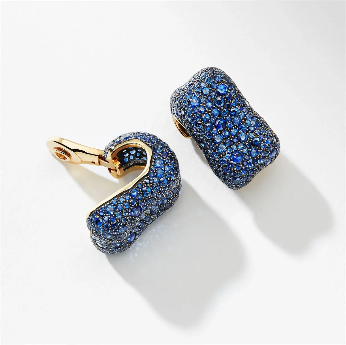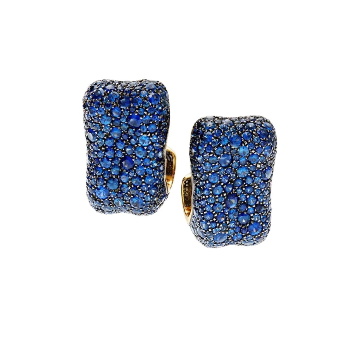 Emotion Yellow Gold & Silver Blue Sapphire Clip-On Earrings feature deep blue sapphires in various sizes and cuts, expertly pavé set onto the undulating surfaces of yellow gold and silver. The organic, fluid design of the earrings, part of the Fabergé Emotion collection, creates a captivating ripple of light and shade, while showcasing the intense colour and bold design characteristic of the collection. The earrings embody the bohemian, impressionist, and fauvistic approach to vivid colour as an emotional force and an expression of feeling.
