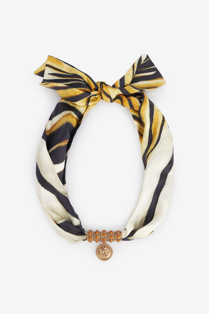 Crafted with high-quality metal components and adorned with printed silk fabric. The necklace is designed for versatility and comfort, making it suitable for various occasions.