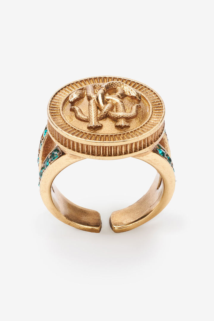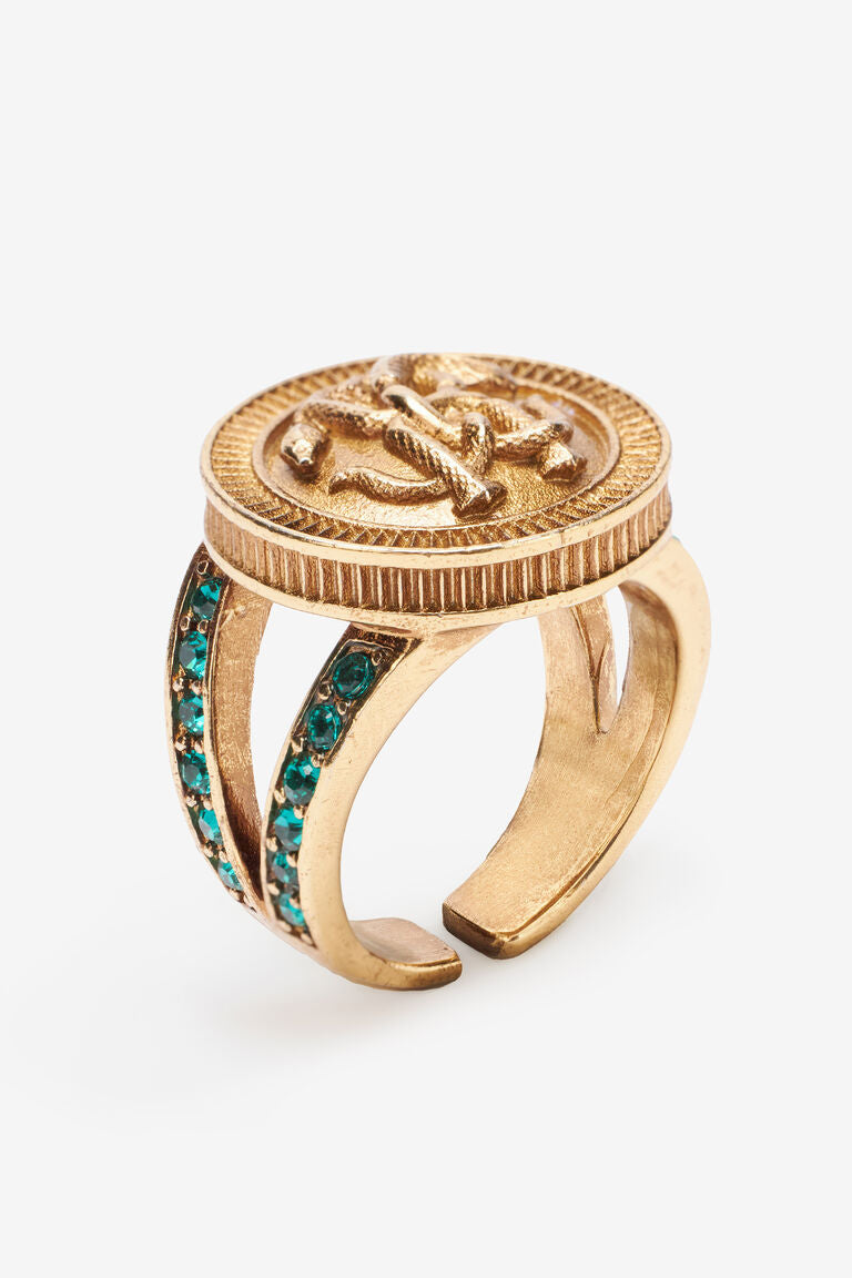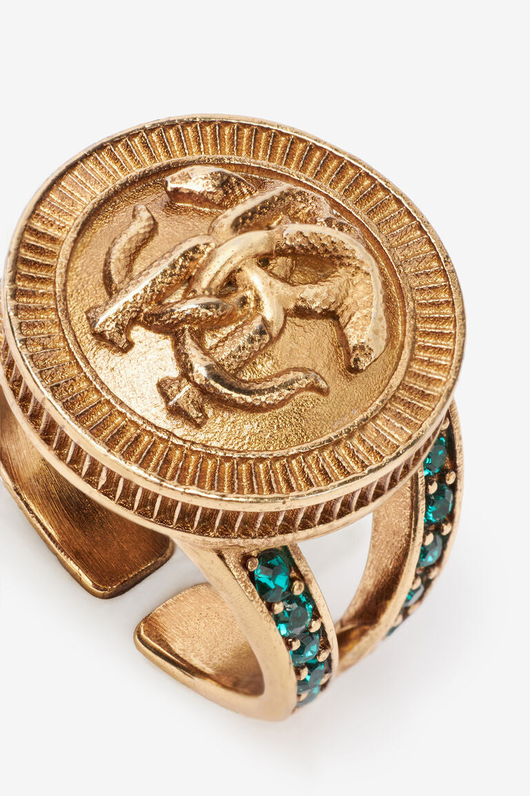 This Ring with Logo RC by Roberto Cavalli embodies the brand's signature elegance and bold design. Featuring the iconic RC logo, it adds a touch of luxury to any ensemble. The gold-tone finish enhances its sophisticated appeal, making it a versatile accessory suitable for both casual and formal occasions. Ideal for those who appreciate refined jewelry with a statement-making edge.