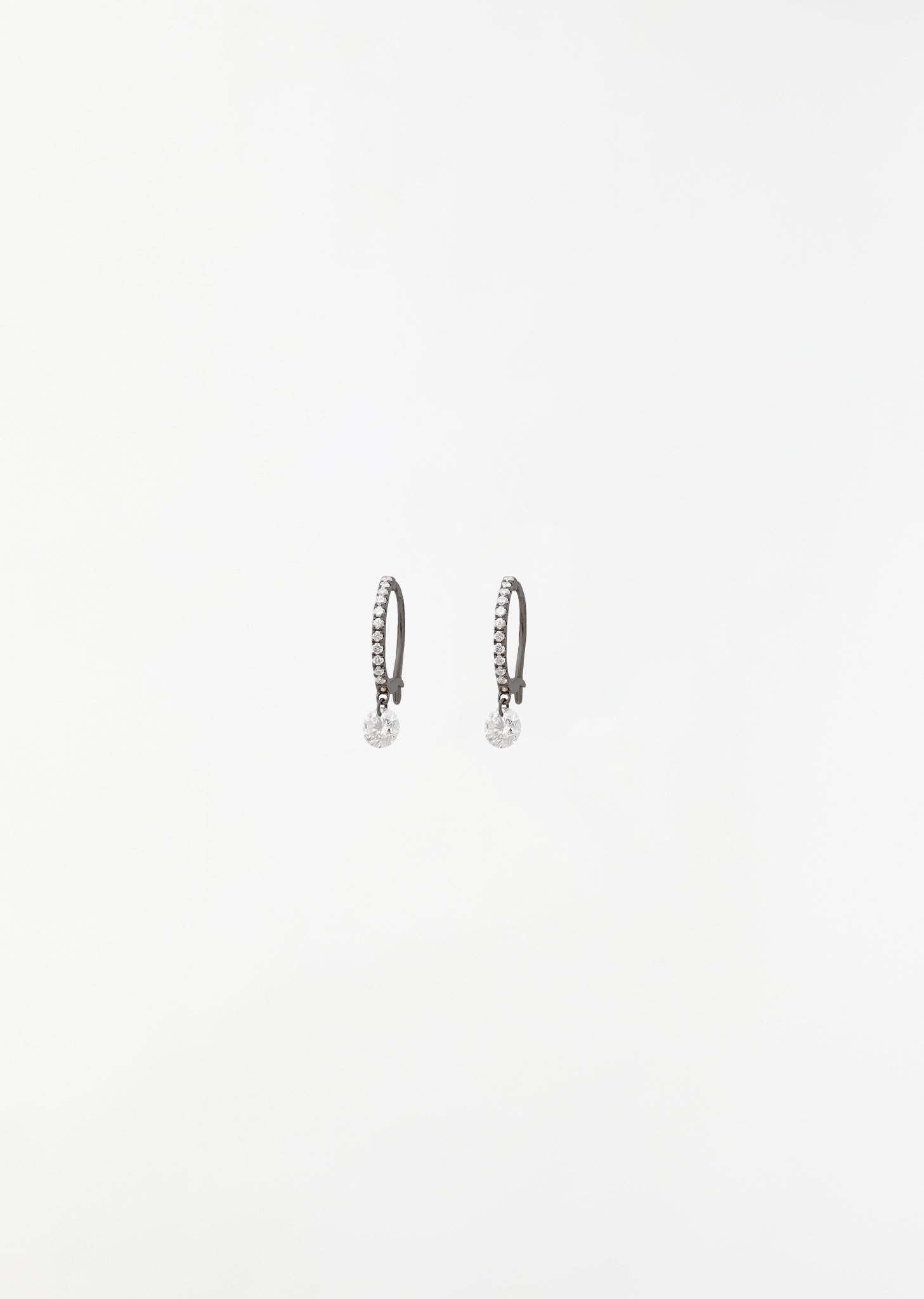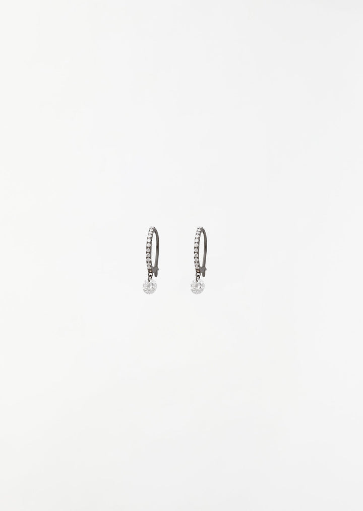 These black gold and white diamond earrings by Raphaele Canot feature two sparkling diamonds totaling 0.40 carats. The hoops are delicately set with a micro pavé of white diamonds, designed to elegantly follow the ear lobe line. A secure clasp at the back ensures a perfect fit, making them ideal for everyday wear or special occasions.