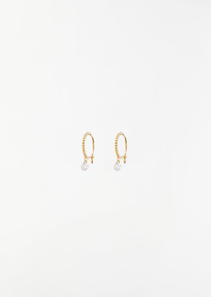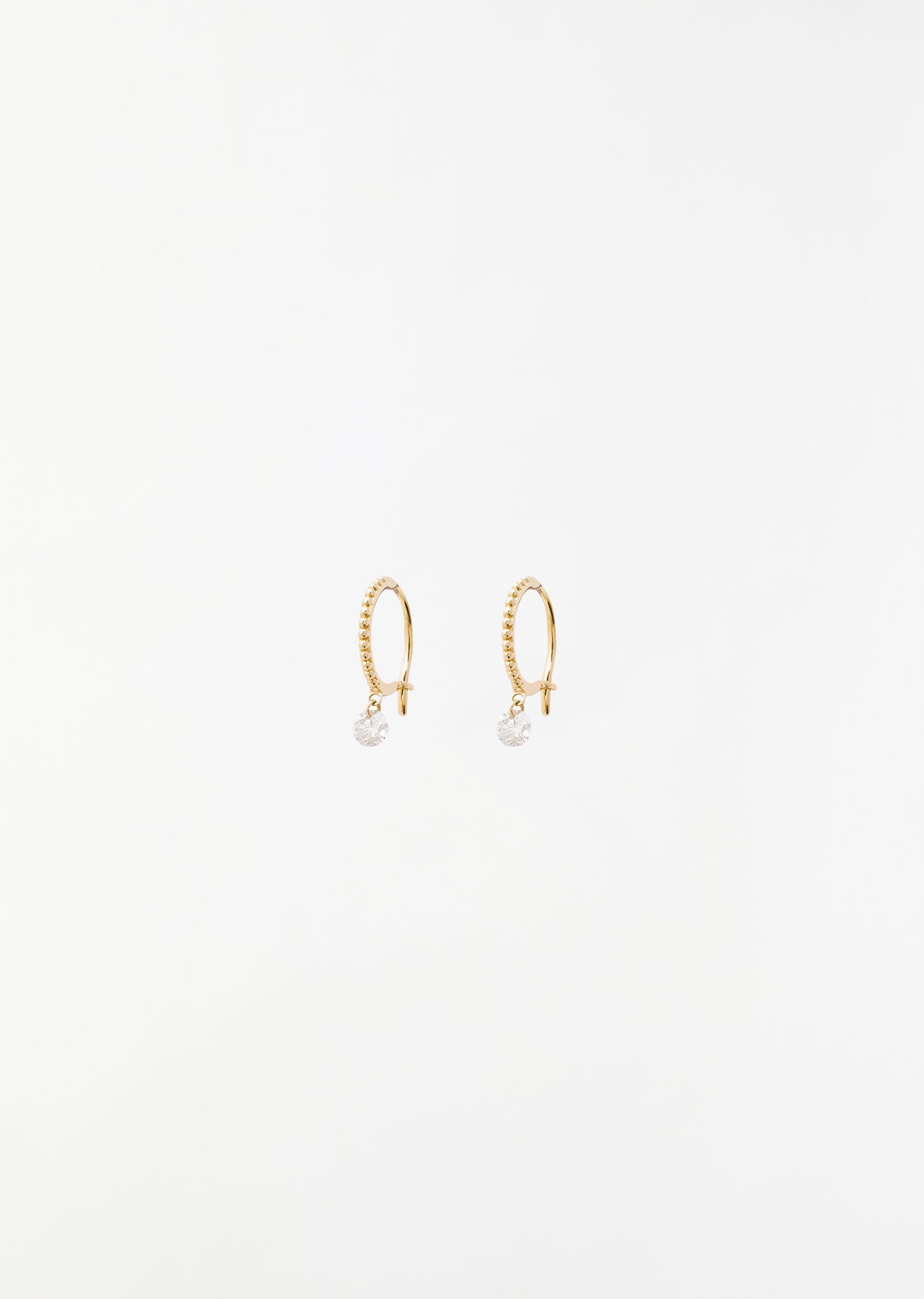 These yellow gold and white diamond earrings by Raphaele Canot showcase two luminous diamonds totaling 0.30 carats. The hoops are enhanced with a delicate beaded motif, adding texture and refinement. Designed to follow the ear lobe line with a secure clasp at the back, they are versatile and timeless.