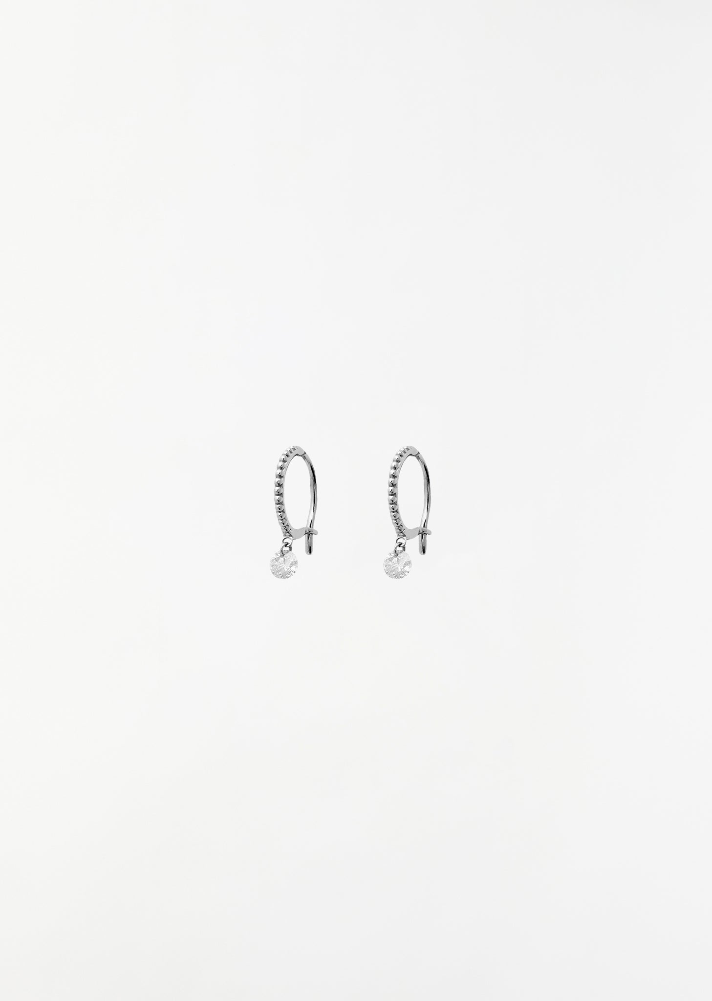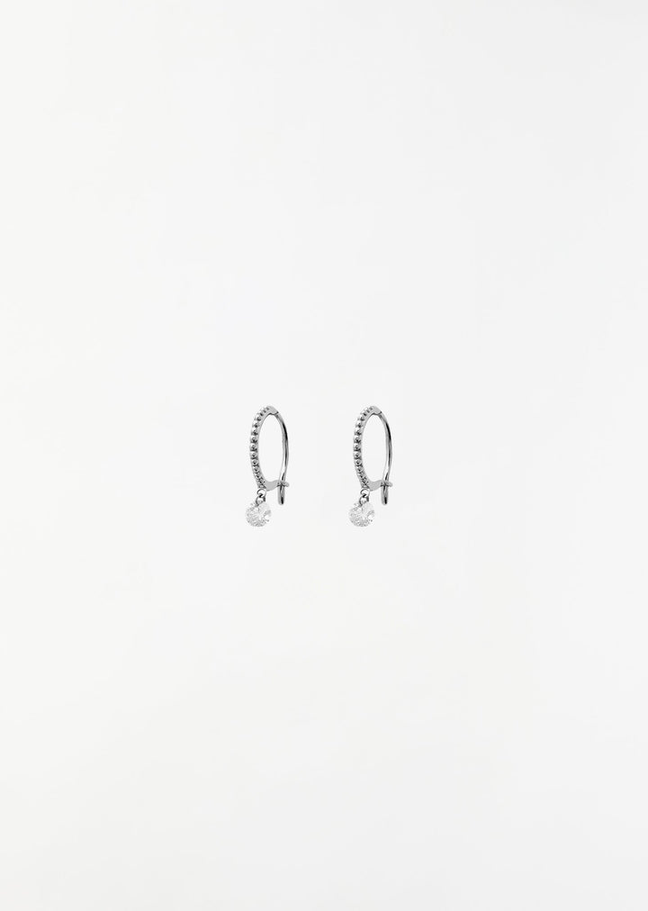 These white gold and white diamond earrings by Raphaele Canot are adorned with two diamonds totaling 0.30 carats. Featuring a subtle beaded motif, the design combines elegance and sophistication. Designed to follow the ear lobe line with a secure clasp at the back, they seamlessly elevate any look.