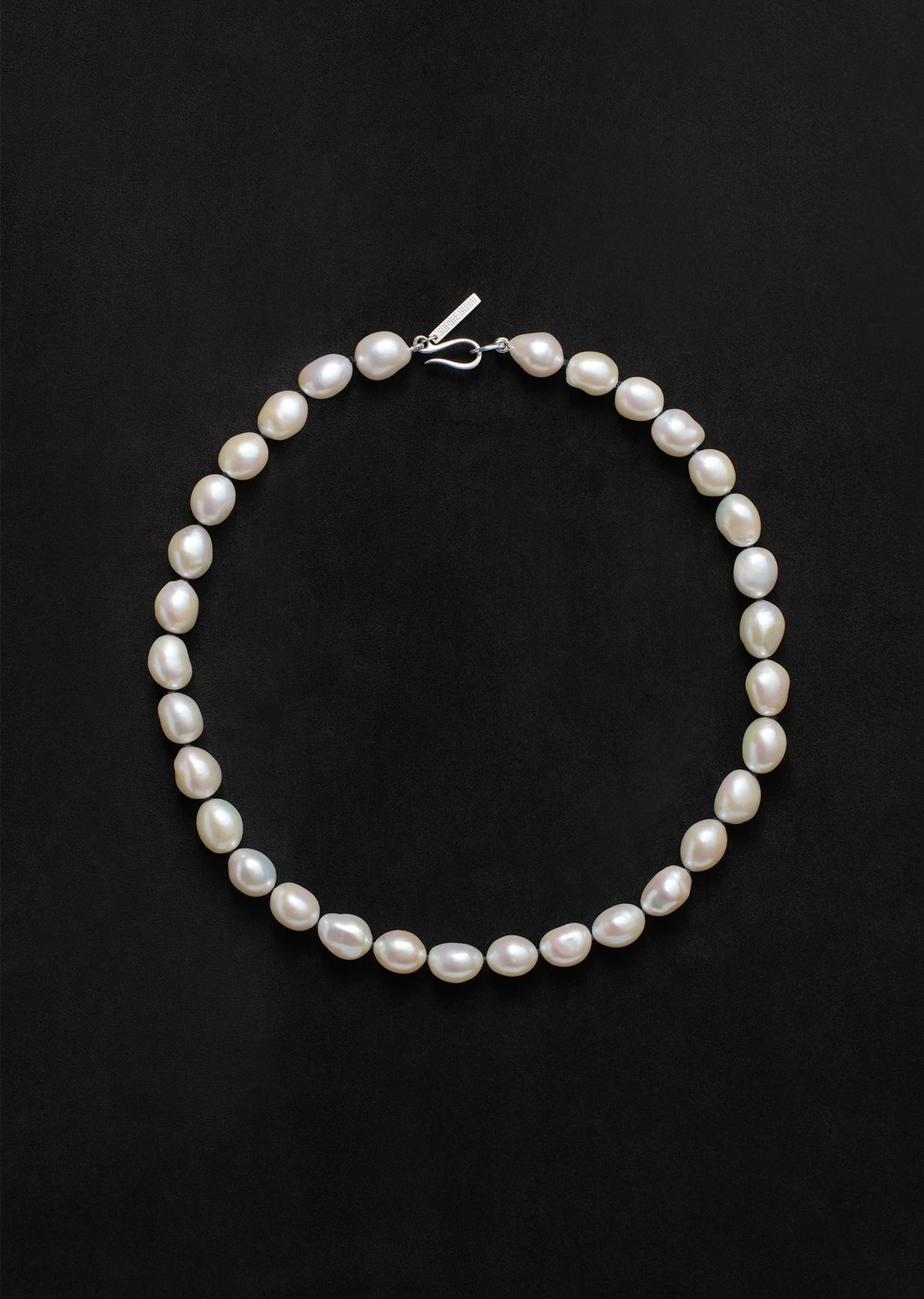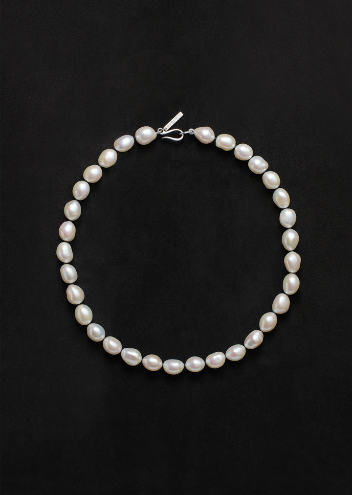 Freshwater pearls and 100% sterling silver. Measures approximately 15 inches in length. Handcrafted in Los Angeles.