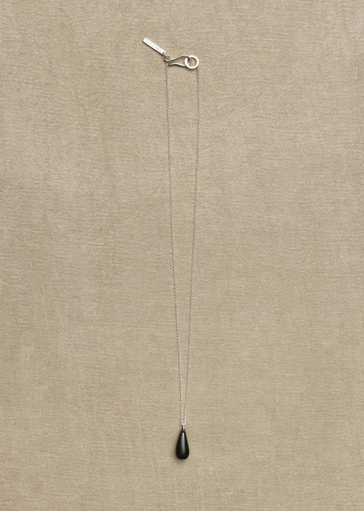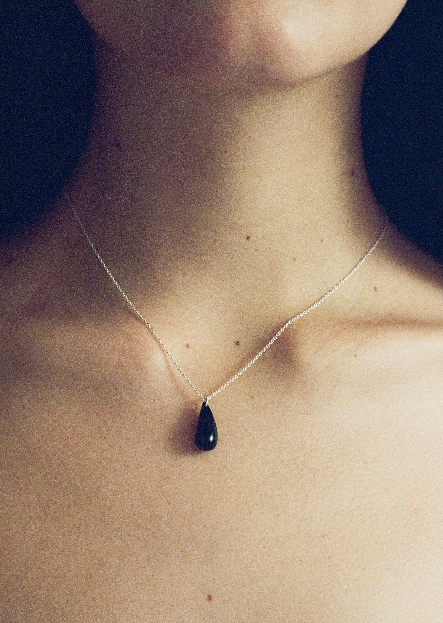 Handcrafted in 100% sterling silver with a hand-carved onyx teardrop (18.2mm). Chain measures approximately 16 inches in length. Made in Los Angeles.