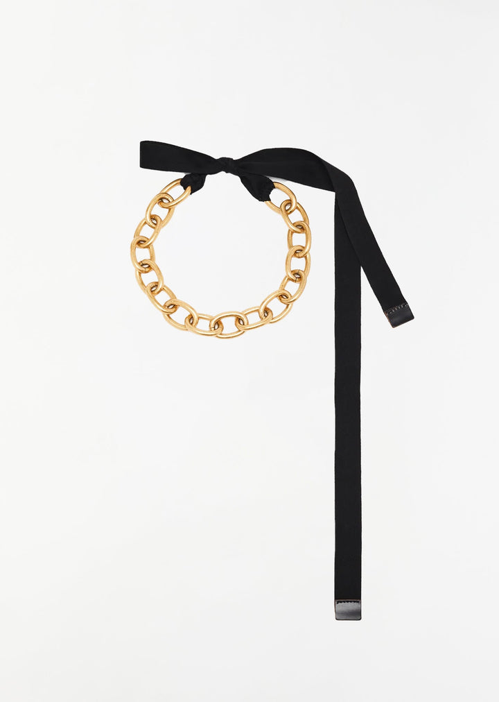 This chunky gold chain necklace by Plan C is a bold statement piece with a touch of elegance. The adjustable black cotton bow adds versatility and a contrasting detail to its modern design.