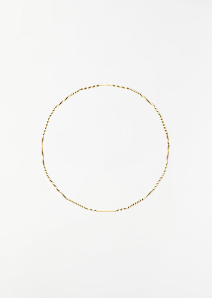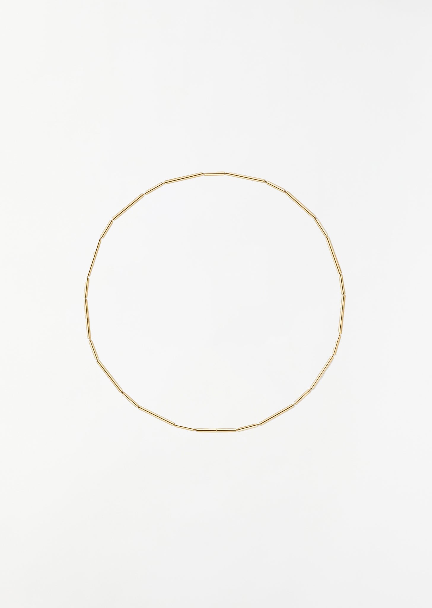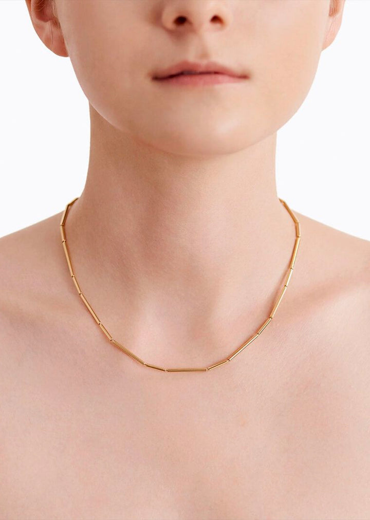 This bead chain necklace by Shihara features alternating 2cm and 1cm gold tubes for a minimalist, geometric design. The concealed screw clasp offers a seamless and modern finish, making it a versatile addition to any outfit.