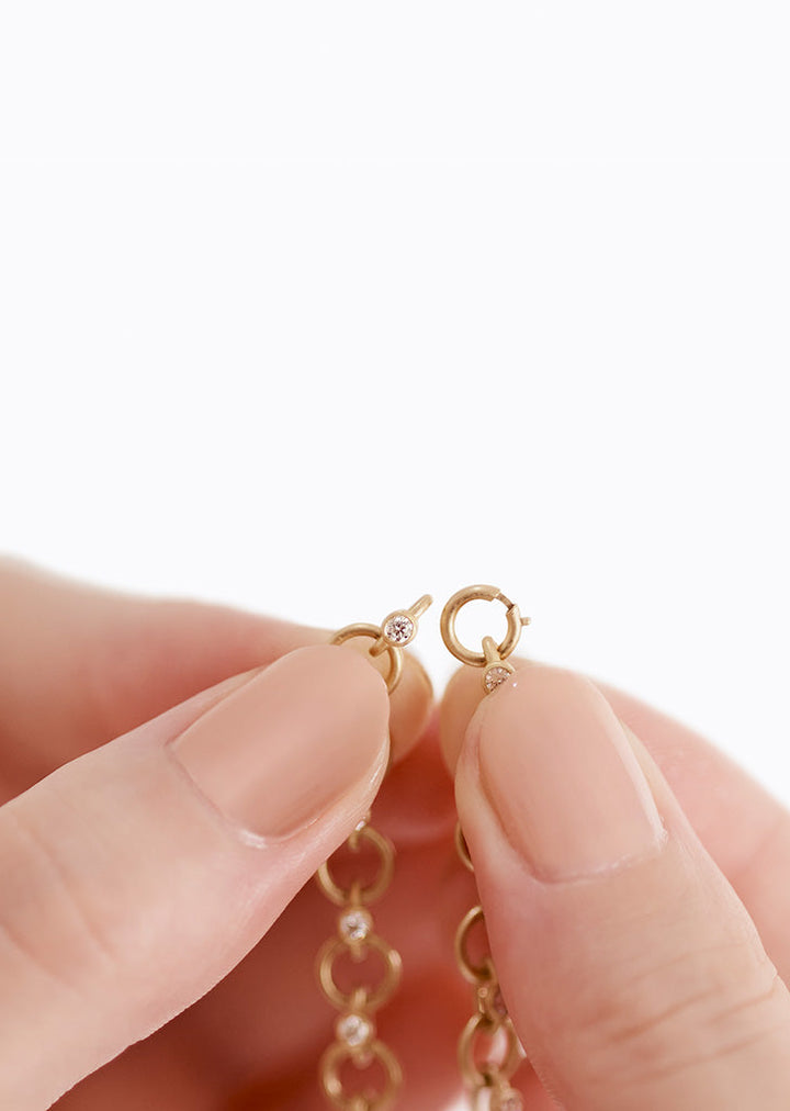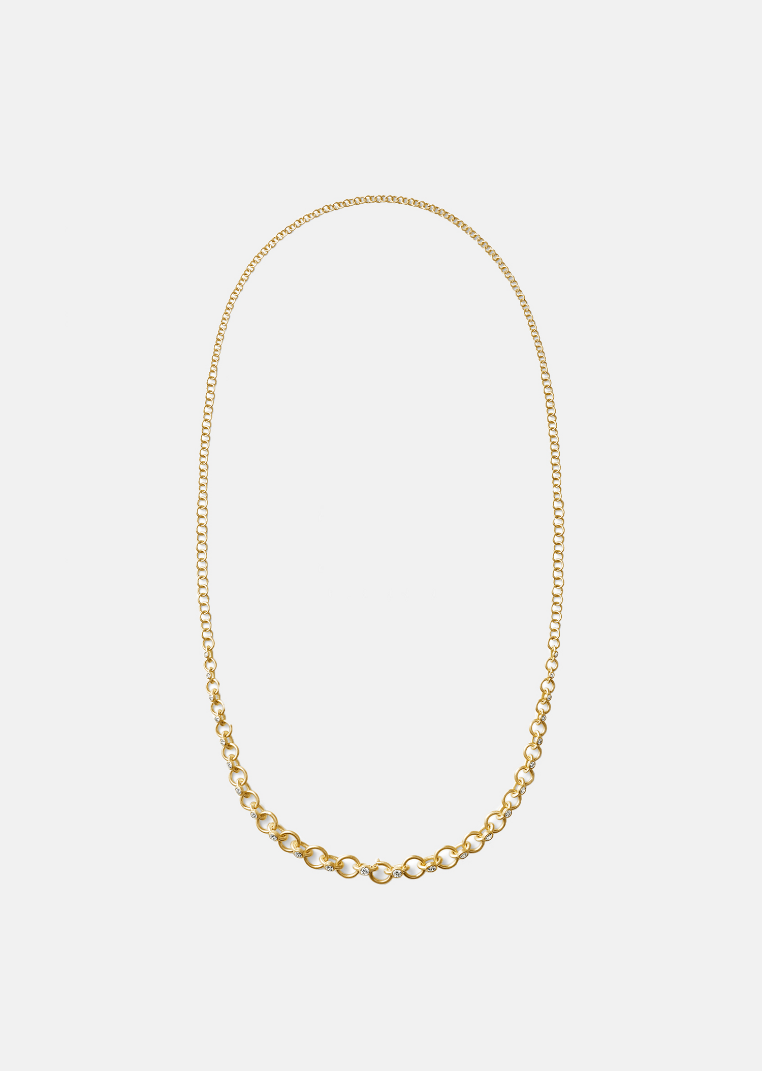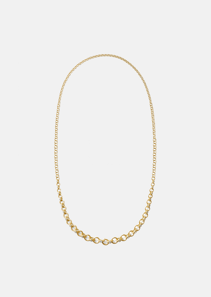 The Diamond Link Necklace by Shihara combines elegance and versatility with a graduated chain design featuring circular links alternated with spacer links set with diamonds. The concealed spring-ring clasp allows for modern styling, including wearing the clasp and excess chain at the front.