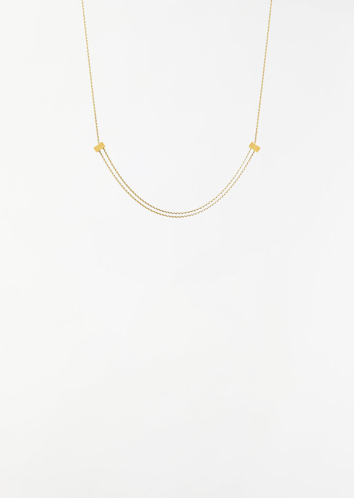 This adjustable rectangle cube necklace by Shihara features two movable cubes on a sleek 18k yellow gold chain. The cubes allow for various styling options, offering a minimalist yet dynamic design.