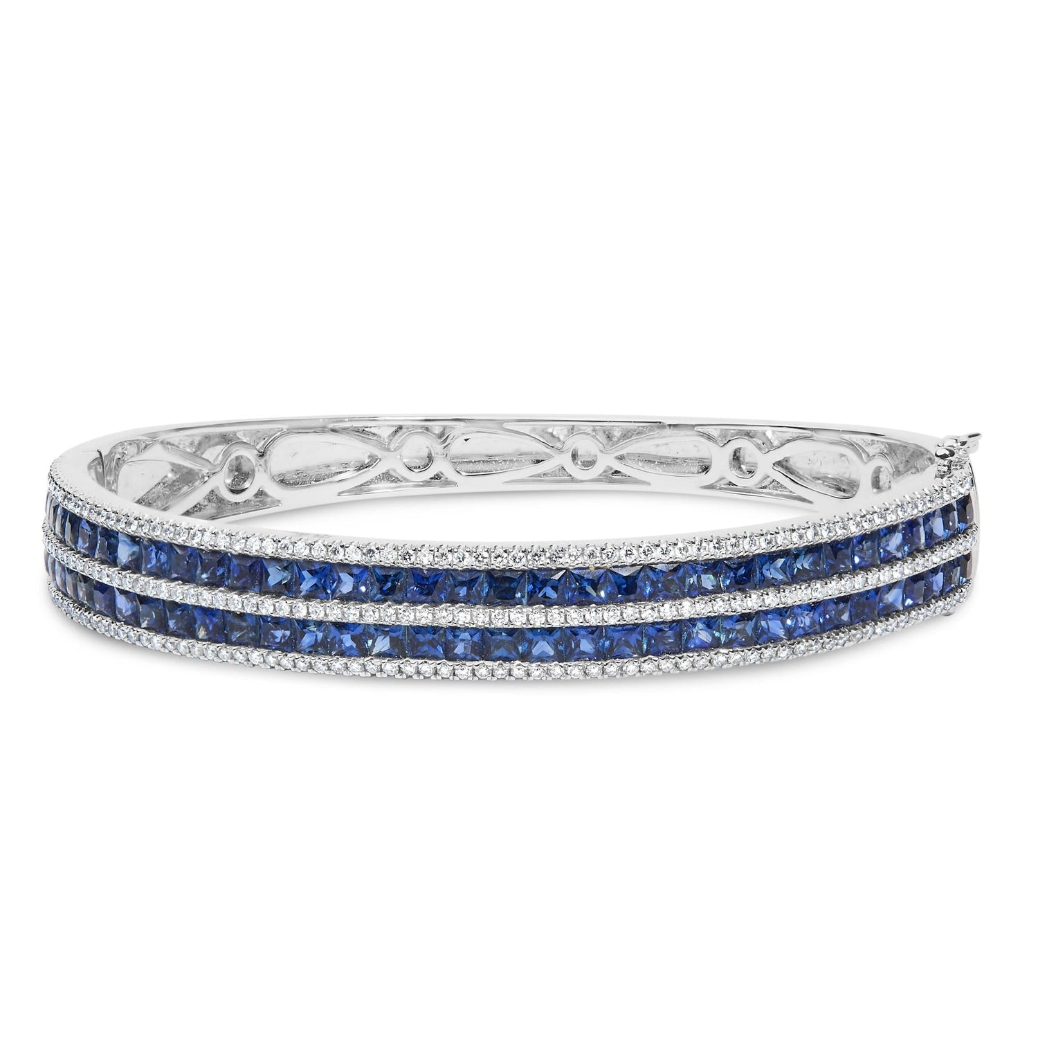 18K White Gold Alternating Diamond and 8.00 Cttw Princess Cut Blue Sapphire Multi Row Bangle Bracelet (G-H Color, VS1-VS2 Clarity) - 7' Inches