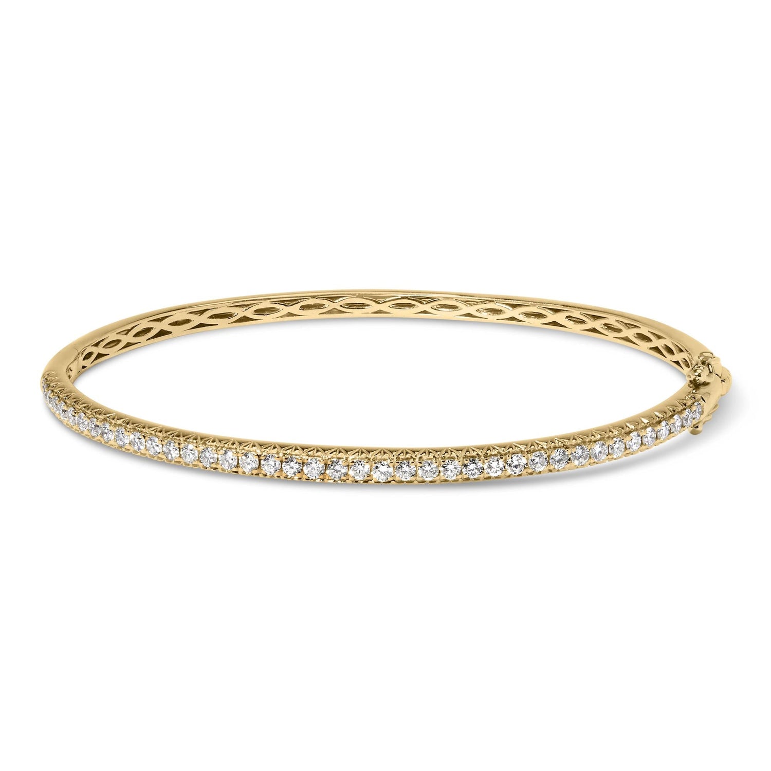 This 14K Gold 1.00 Cttw Half Eternity Diamond Bangle Bracelet by Haus of Brilliance radiates timeless elegance. Adorned with 1.0 carat of round diamonds in a pave setting, the bracelet sparkles with unmatched brilliance. The diamonds, graded H-I in color and SI2-I1 in clarity, add an ethereal glow to this classic piece. Crafted in 14K yellow gold, the bangle features an intricate lattice design on the inner side, ensuring beauty inside and out. Securely fastened with a box tongue and double safety latch, this bracelet promises both luxury and comfort.
