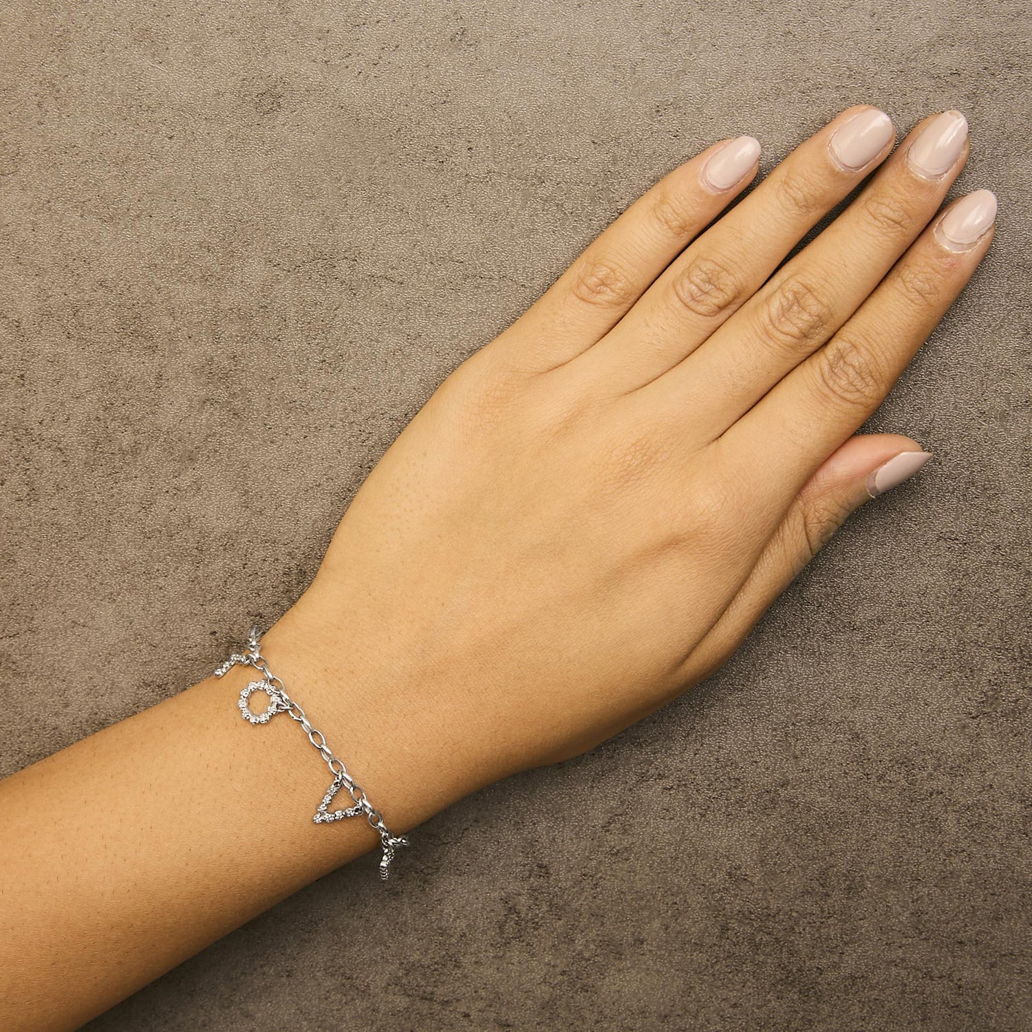 The 10k White Gold 1/6 Cttw Diamond 'Love' Charm Cable Chain Bracelet by Haus of Brilliance radiates romance. Each letter of the word 'LOVE' is encrusted with natural diamonds totaling 1/6 carat, sparkling with H-I color and I1-I2 clarity. The bracelet is crafted from rhodium-plated 10k white gold, offering both luster and durability. With a lobster claw clasp and 7-inch length, this bracelet is the perfect way to express love, making it an ideal gift or personal treasure.