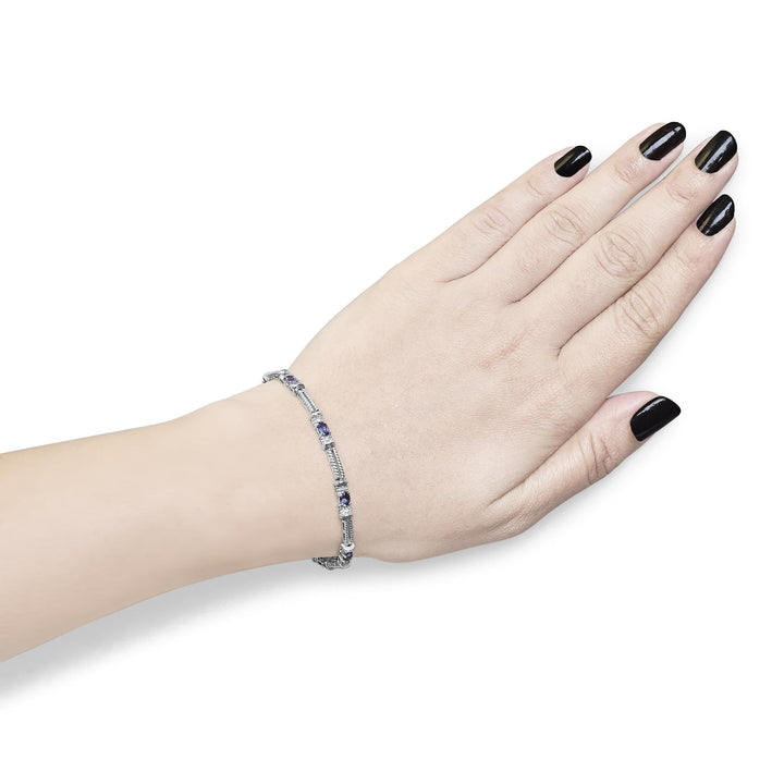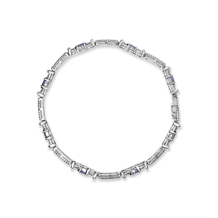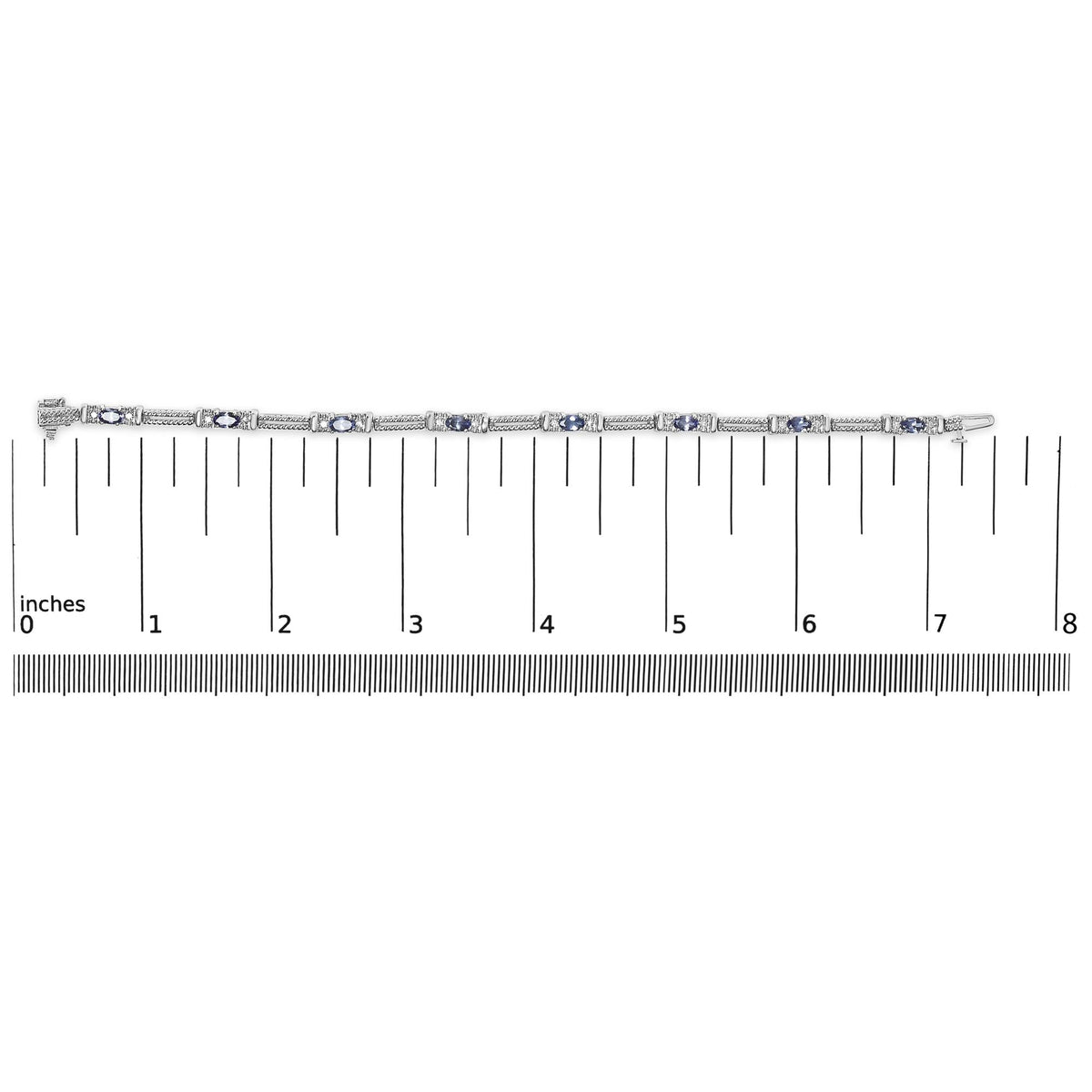 Crafted in 14K white gold with natural tanzanite gemstones and diamond accents. H-I color, SI1-SI2 clarity for diamonds. Total diamond weight included. Rhodium-plated finish. 7-inch length. Box clasp with safety latch.