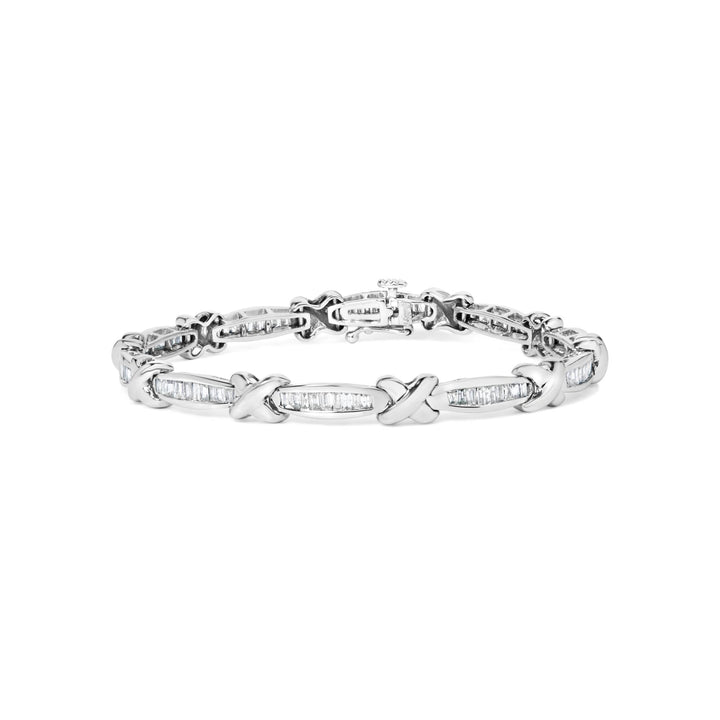 This 14K White Gold Baguette-Cut Diamond X-Link Bracelet by Haus of Brilliance features rows of baguette-cut diamonds set in a channel setting, delicately offset by interlocking X-shaped bands of 14K white gold. The bracelet, with a total diamond weight of 2.00 carats, adds both sparkle and sophistication to any outfit.