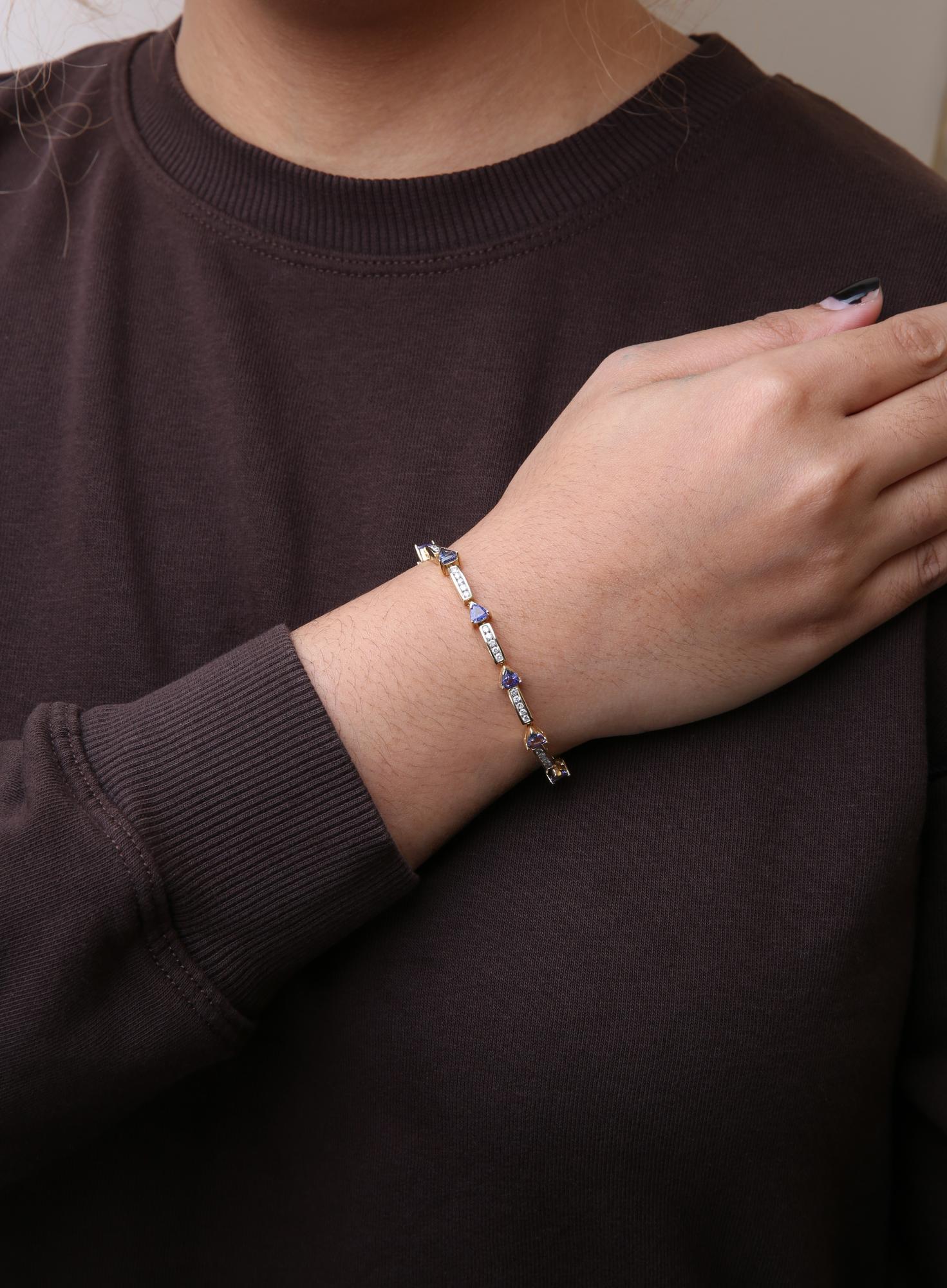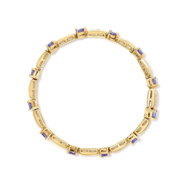This 14K Yellow Gold Blue Tanzanite and 1 1/10 Cttw Diamond Tennis Bracelet by Haus of Brilliance is an exquisite celebration of color and sophistication. Featuring 12 trillion-cut blue tanzanites, each measuring 5mm, this bracelet is punctuated with over a carat of round-cut diamonds. The deep blue of the enhanced natural tanzanite stones contrasts beautifully with the warm gold setting and shimmering diamonds. This elegant 7-inch piece is secured with a box and latch clasp, making it ideal for evening elegance or a refined everyday look.