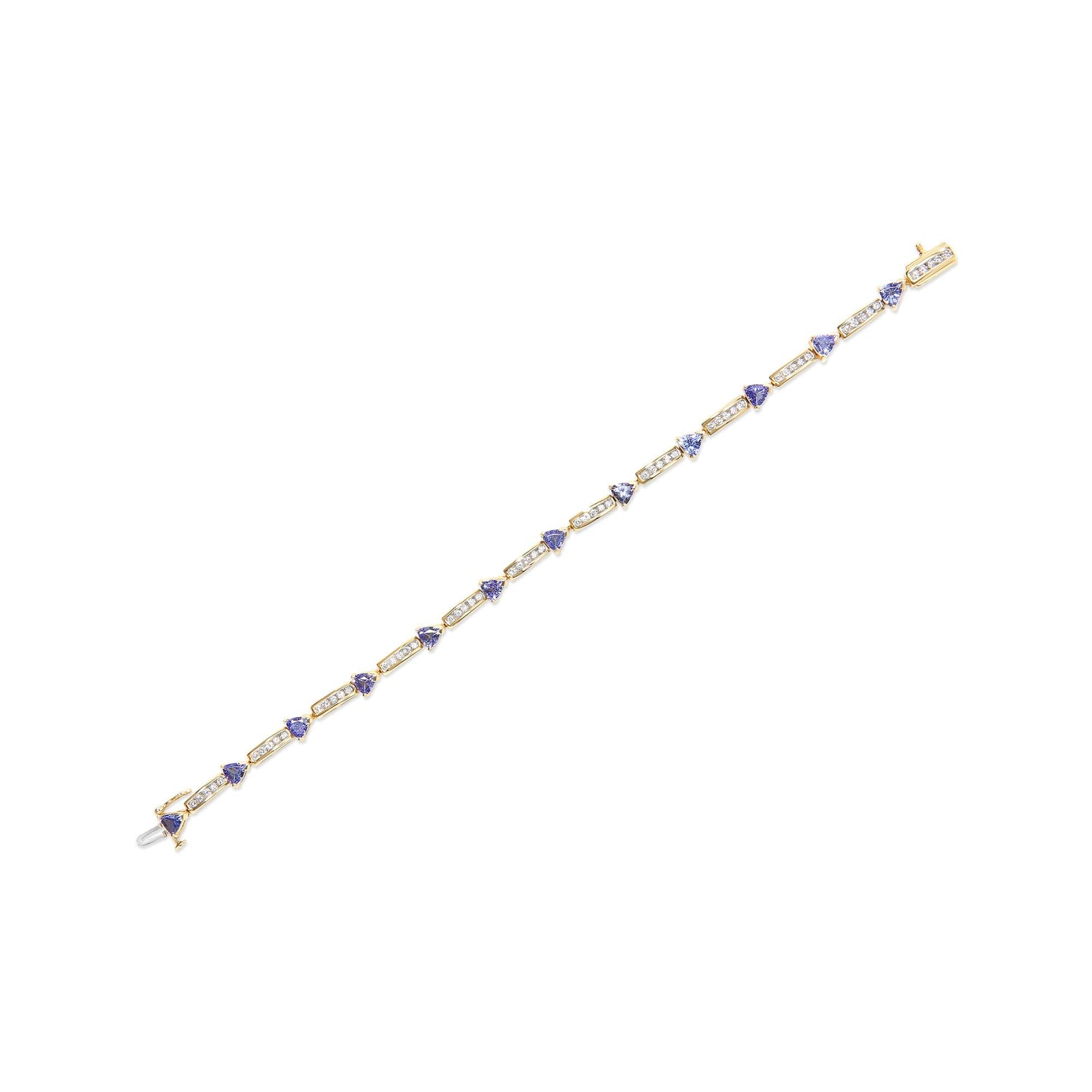 Crafted in 14K yellow gold with 12 trillion-cut natural treated blue tanzanites (5mm each) and round-cut natural diamonds totaling 1.10 carats (H-I color, I1-I2 clarity). Measures 7 inches with box clasp.