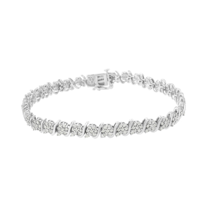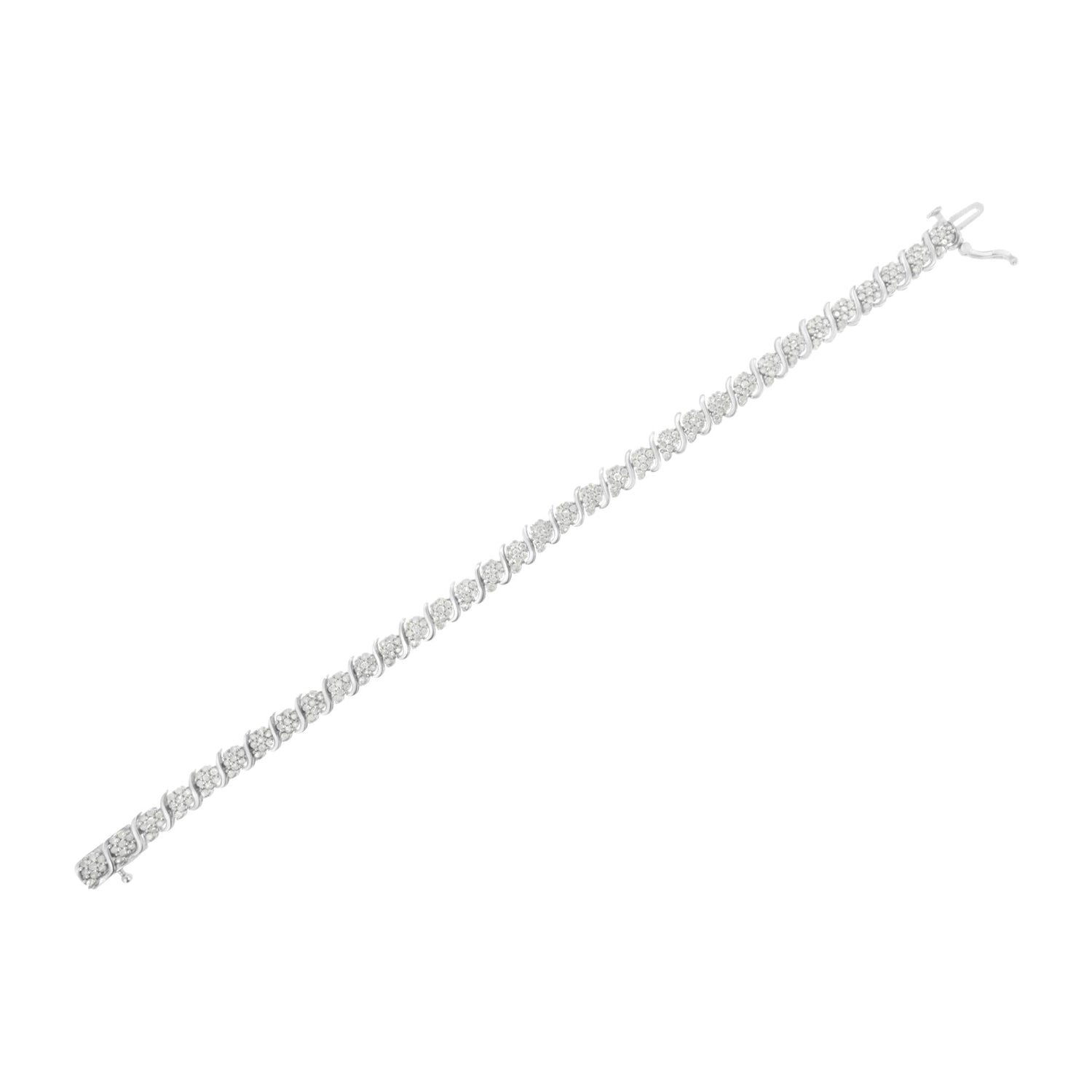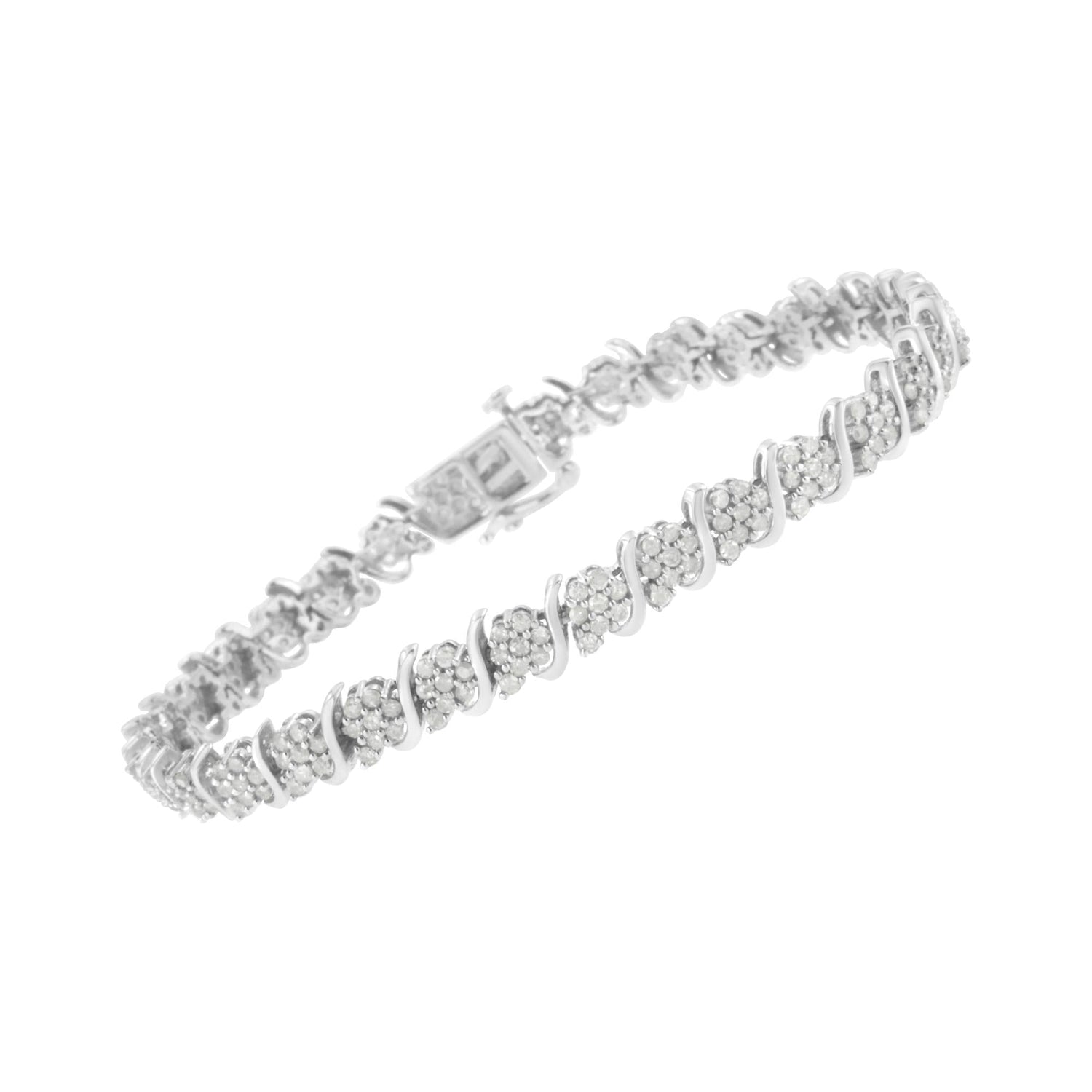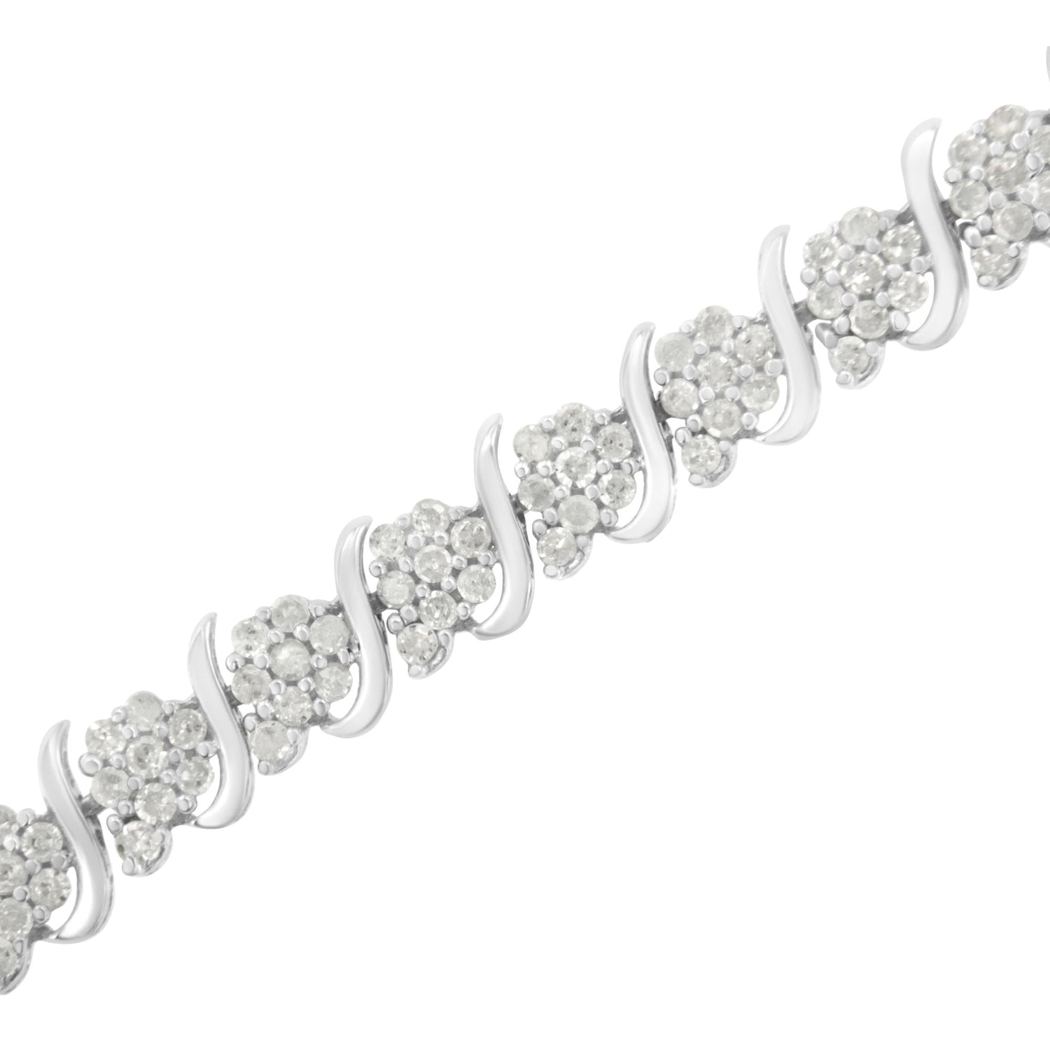 Crafted in .925 sterling silver with 2 3/4ct total weight of round-cut diamonds (I-J Color, I3 Clarity), featuring a floral cluster link design with S-shaped ribbons.