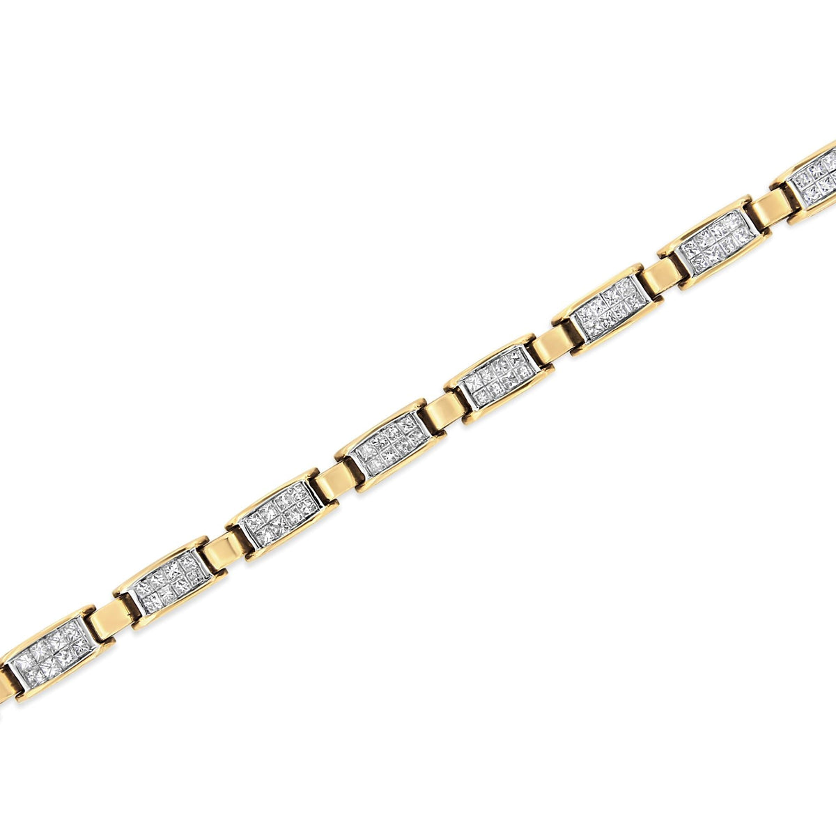 This 14K Yellow Gold 2 1/2 Cttw Princess-Cut Diamond Link Tennis Bracelet by Haus of Brilliance is a geometric pattern link bracelet featuring princess-cut diamonds in an invisible setting. With 2 1/2 cttw of diamonds, this bracelet sparkles on the wrist, making it the perfect addition to your jewelry collection.
