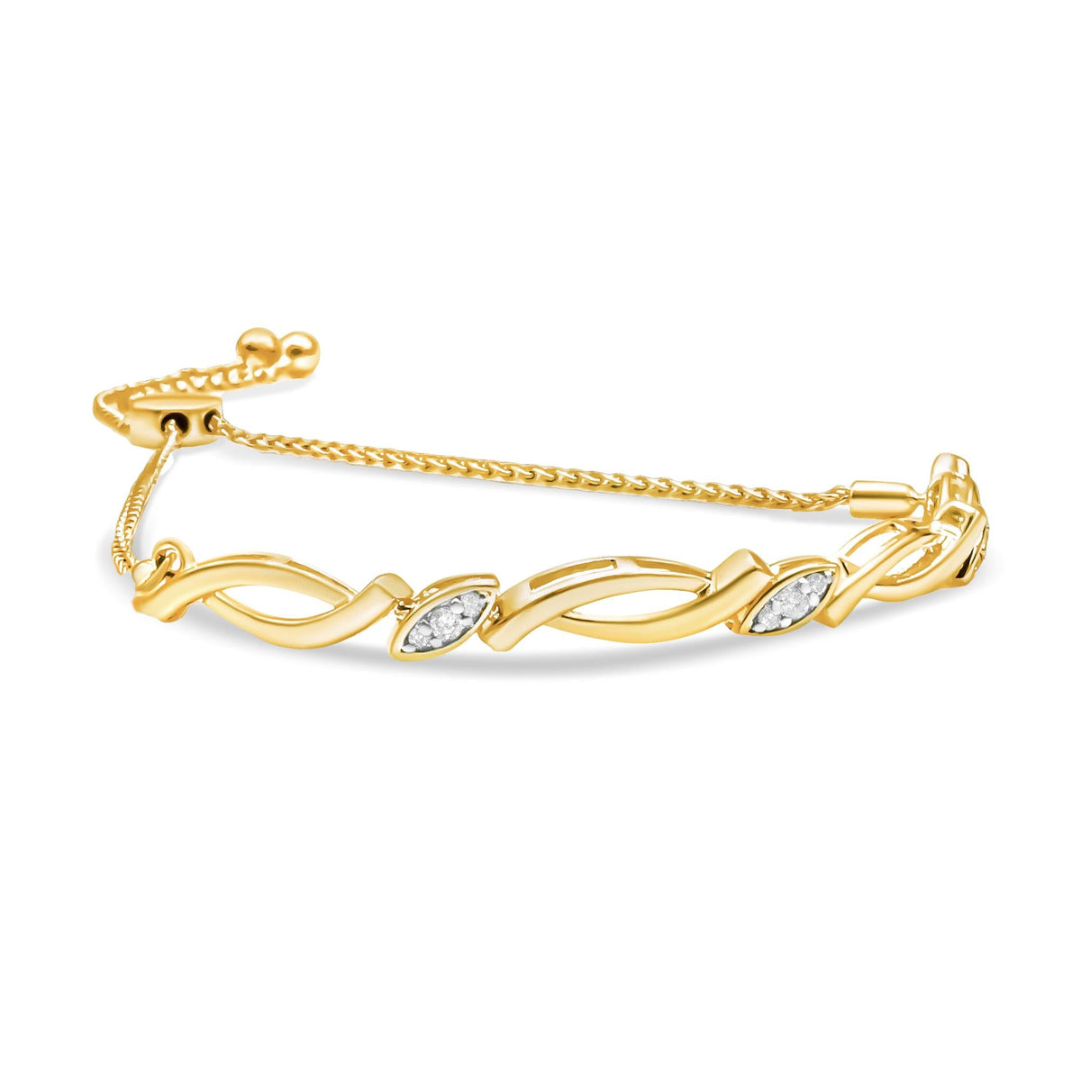This .925 Sterling Silver Diamond Accent Alternating Swirl Bolo Bracelet by Haus of Brilliance sways with elegance and fluid motion. Alternating swirl links plated in 14K yellow gold add sculptural flair, while petite diamonds shimmer across the bracelet’s graceful silhouette. A sliding clasp ensures a perfect fit from day to night, making it a versatile token of style and sentiment.