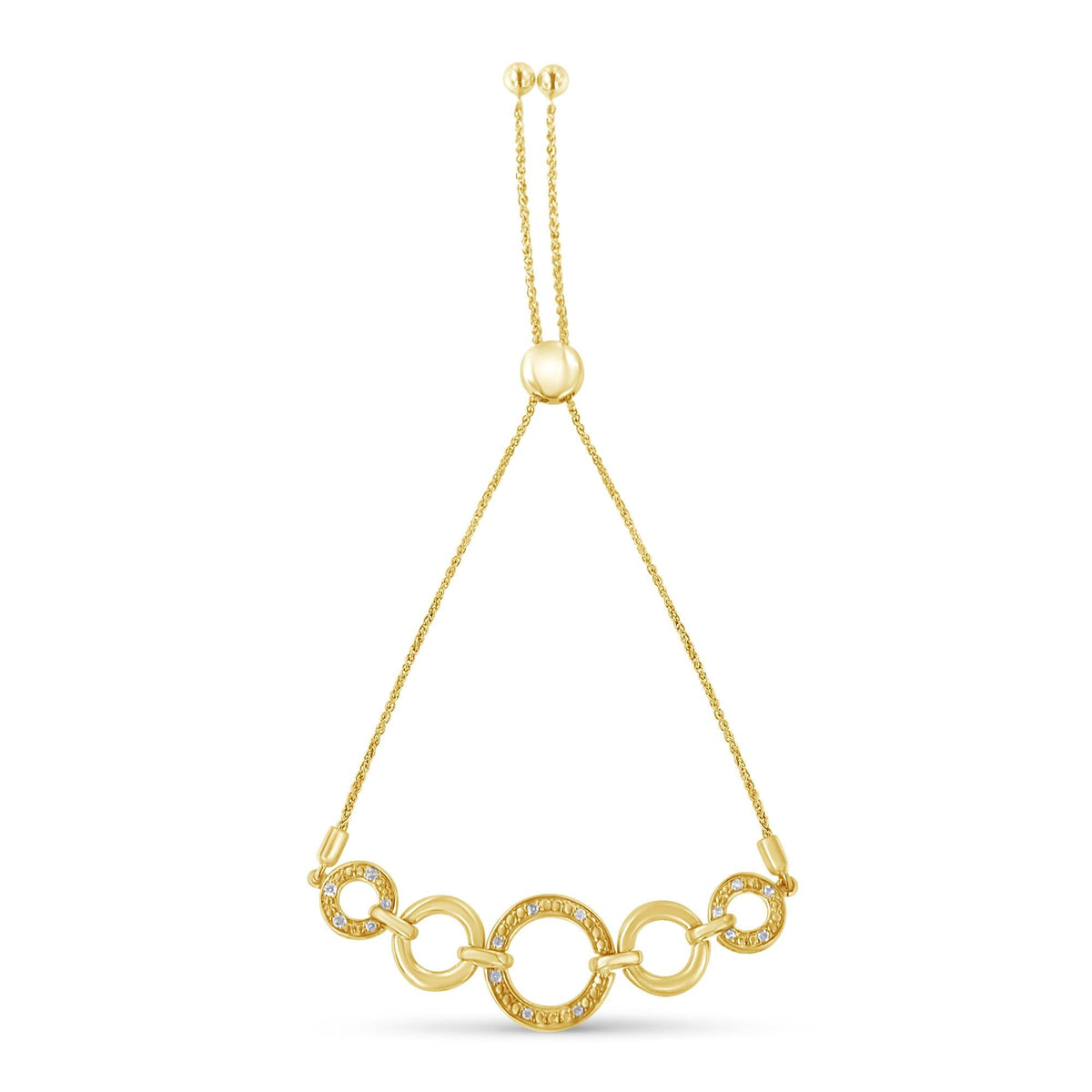 This 10K Yellow Gold over .925 Sterling Silver Diamond Accented Graduated Infinity Open Circle 6”-9” Adjustable Bolo Bracelet by Haus of Brilliance features alternating diamond-studded circles with a secure slider for a customized fit.