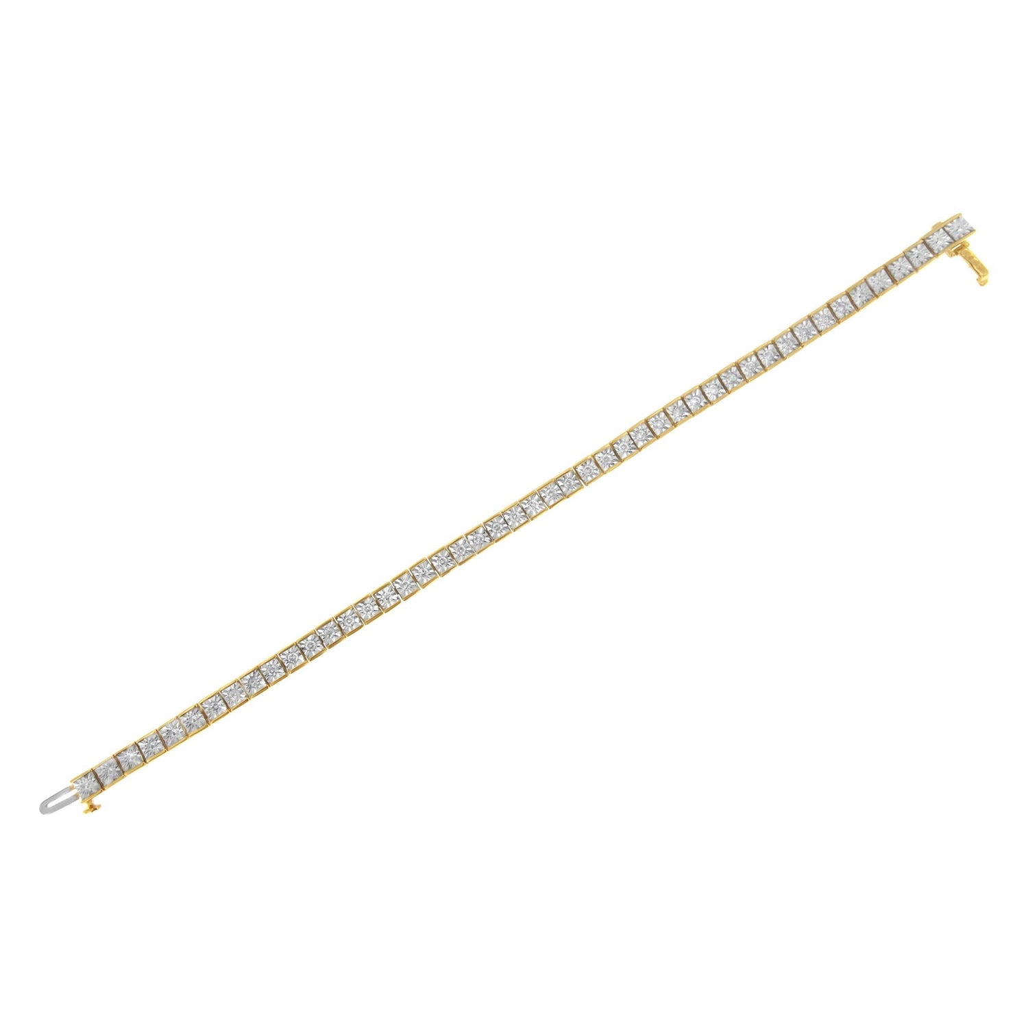 This .925 Sterling Silver 1.0 Cttw Miracle Set Diamond Milgrain Link Tennis Bracelet by Haus of Brilliance is crafted from rhodium-plated .925 sterling silver and plated with 14K yellow gold. Featuring miracle-set diamonds totaling 1.0 carat, this bracelet captures light with every move, magnified by the milgrain detailing. The secure clasp ensures comfort and longevity.