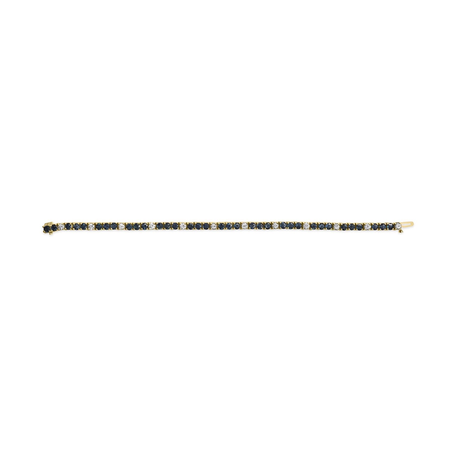 Crafted in 18K yellow gold with round diamonds and blue sapphires, totaling 1 1/5 carats. G-H color, VS1-VS2 clarity. 7" length with box clasp and latch.