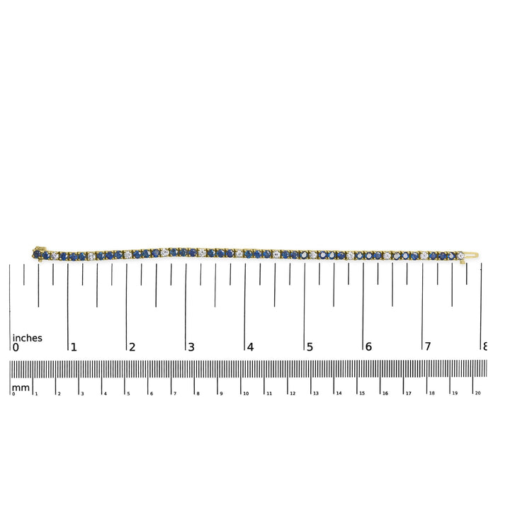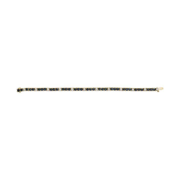 This 18K Yellow Gold Alternating 1 1/5 Cttw Diamond and 3x3 MM Blue Sapphire Tennis Bracelet by Haus of Brilliance is a dazzling combination of color and sparkle. Alternating 3x3mm round blue sapphires and brilliant white diamonds (1 1/5 carat total weight) create a captivating effect that wraps around your wrist. The sapphires, with their deep oceanic blue hue, complement the diamonds' radiant sparkle. Set in luxurious 18K yellow gold, this bracelet features a secure box clasp and latch, ensuring a comfortable fit.