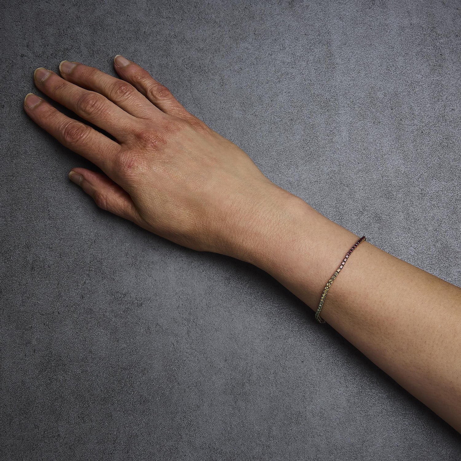 This 14K Yellow Gold Natural Rainbow Gemstone Sapphire and Tsavorite Tennis Bracelet by Haus of Brilliance is a vibrant and colorful piece. Featuring 13 natural gemstones, including blue, yellow, and pink sapphires, green tsavorites, and red garnets, this bracelet is a kaleidoscope of color. The gemstones are set in secure 4-prong settings, ensuring both durability and elegance. Finished with a box clasp, this bracelet offers both style and security for all-day wear.