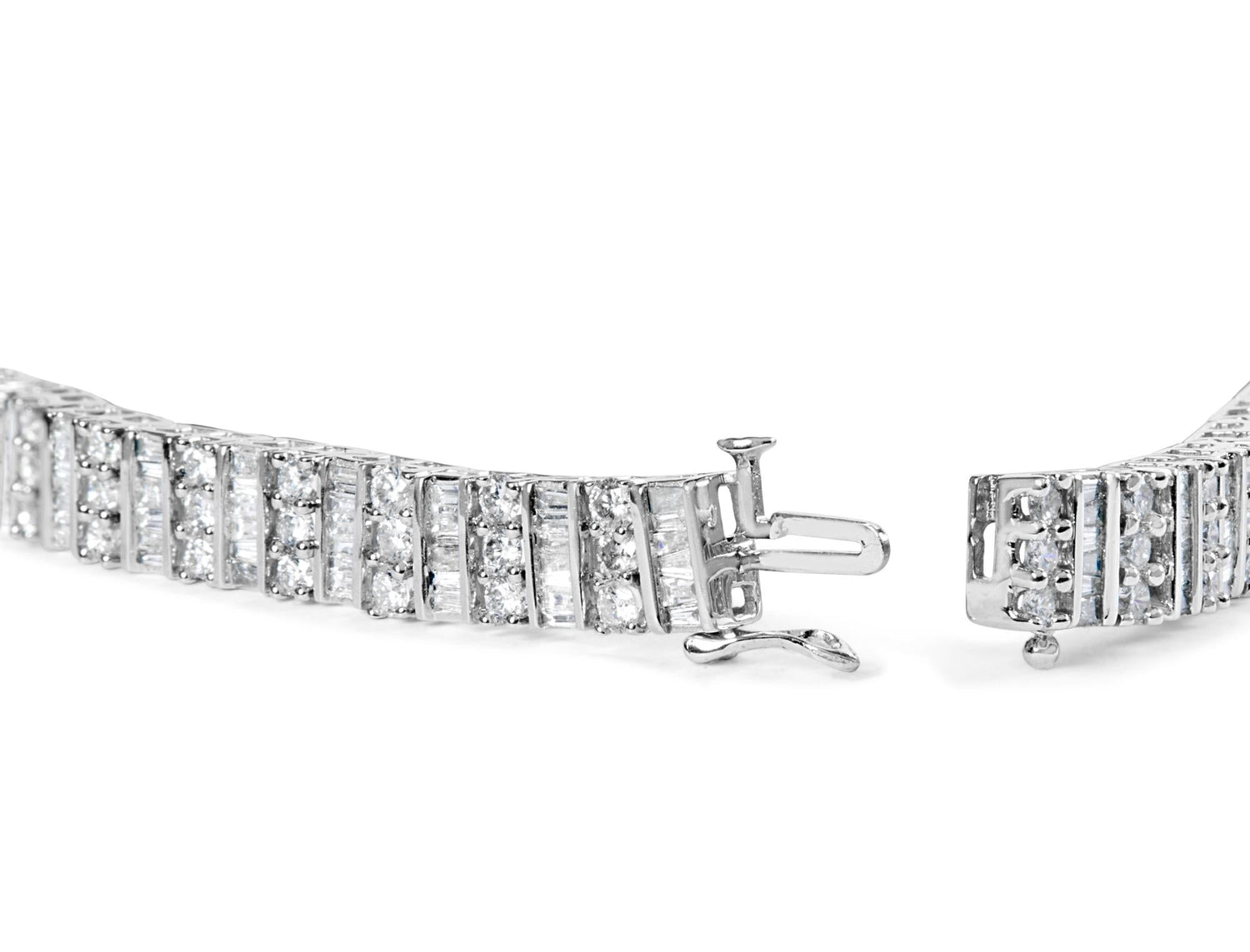 Made in 14K white gold with 6.00 cttw of natural round and baguette diamonds (H-I color, I1-I2 clarity). Measures 7 inches with secure box clasp and safety latch.