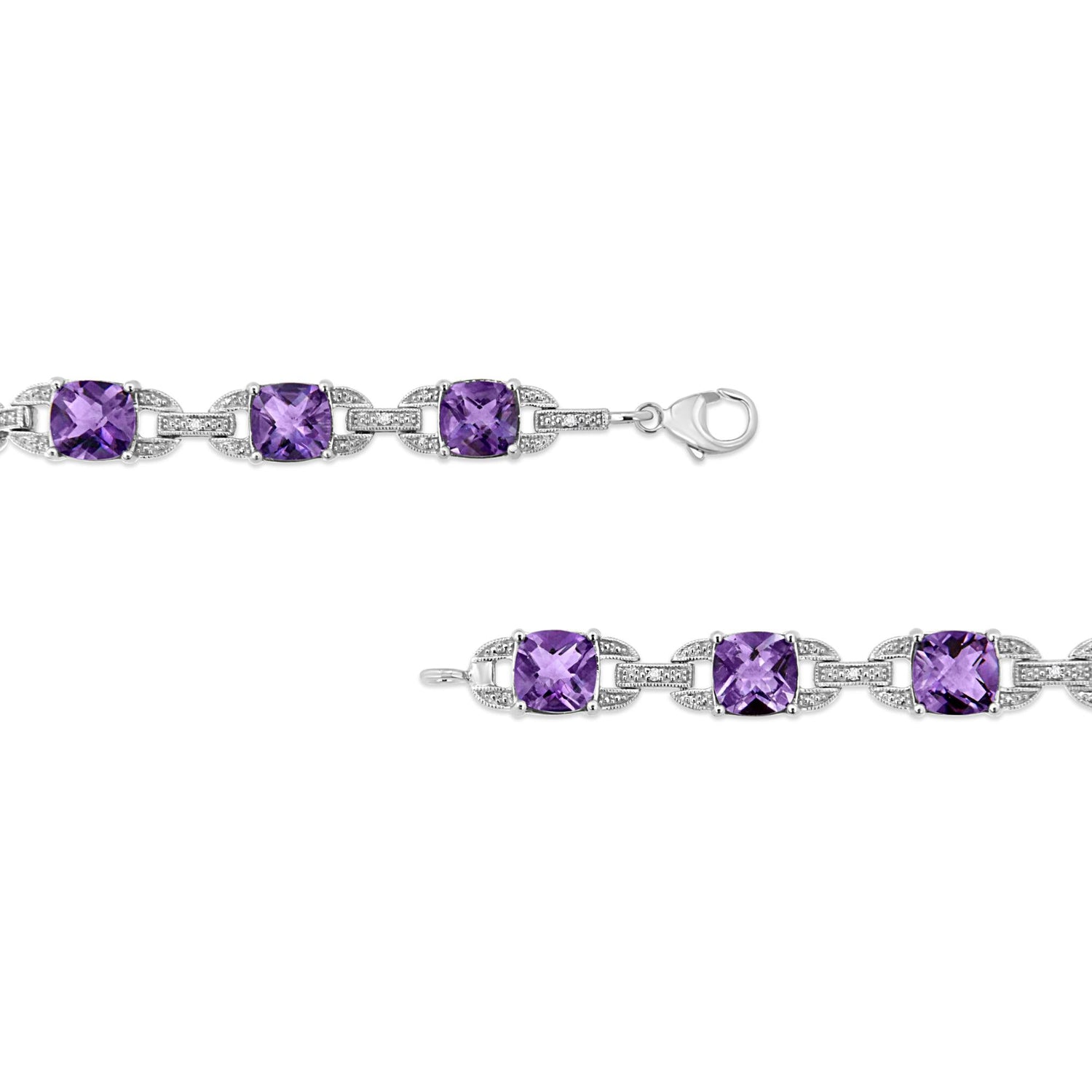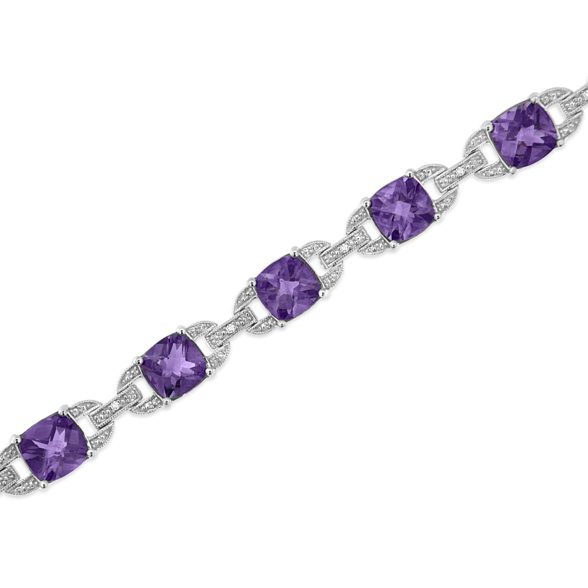 Made from .925 sterling silver. 7mm cushion-cut amethyst gemstones. 1/20 cttw of round diamonds. Diamond Color: I-J, Clarity: I1-I2. Size: 7 inches.