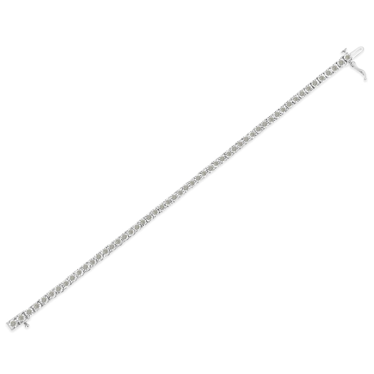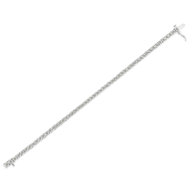 Handcrafted in rhodium-plated .925 sterling silver with round diamonds totaling 3.0 carats (I-J color, I3 clarity). Features miracle-plate illusion settings. 7'–7.25' length with secure clasp.