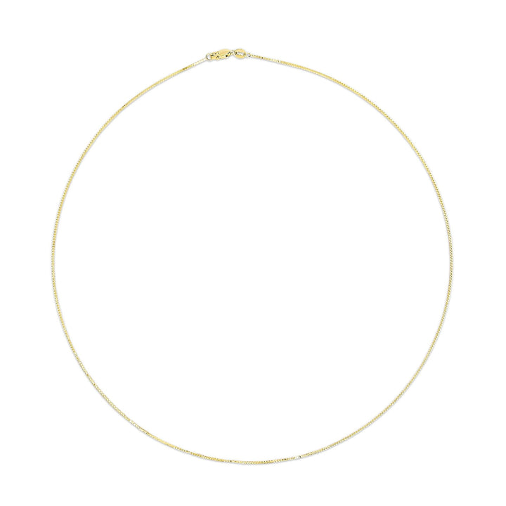 Solid 14K yellow gold box chain with a width of 0.75mm and length of 22 inches. Features a lobster clasp for secure closure.