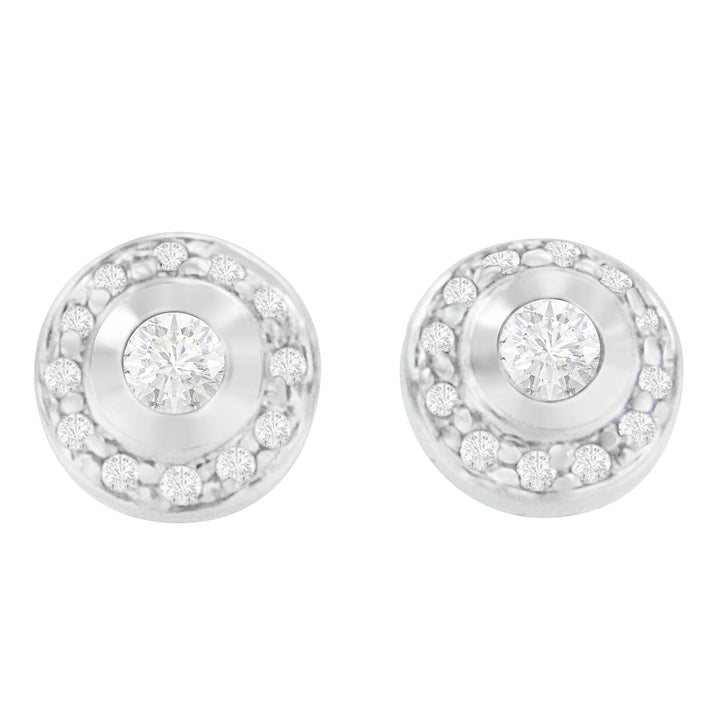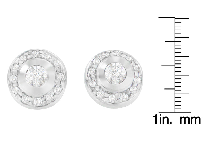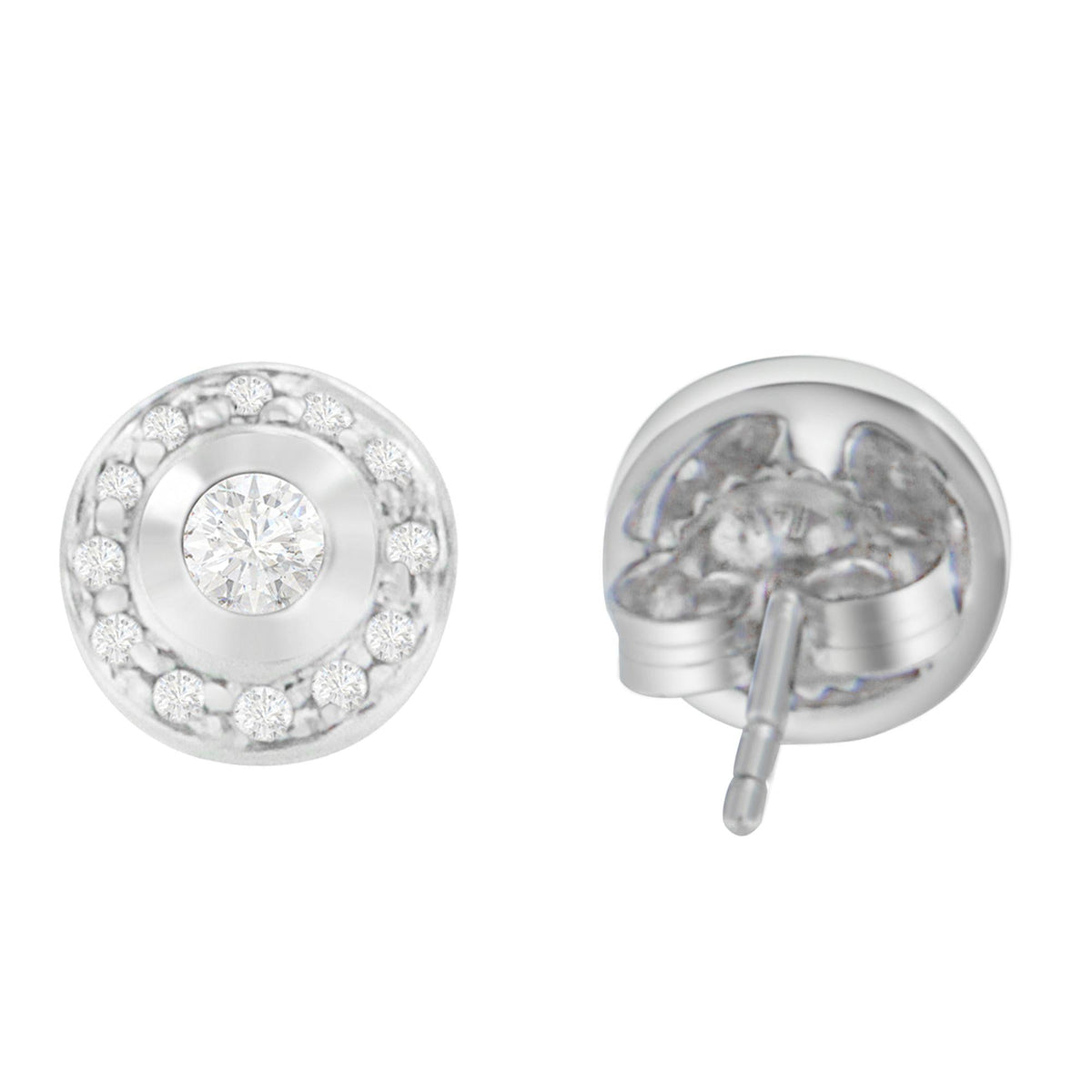 These 14K White Gold 1/3 CTTW Round Cut Diamond Earrings by Haus of Brilliance feature classic round diamond studs, with a central prong-set diamond embraced by a circle of smaller bezel-set diamonds. These earrings, crafted in 14K white gold, offer a timeless and sophisticated look.
