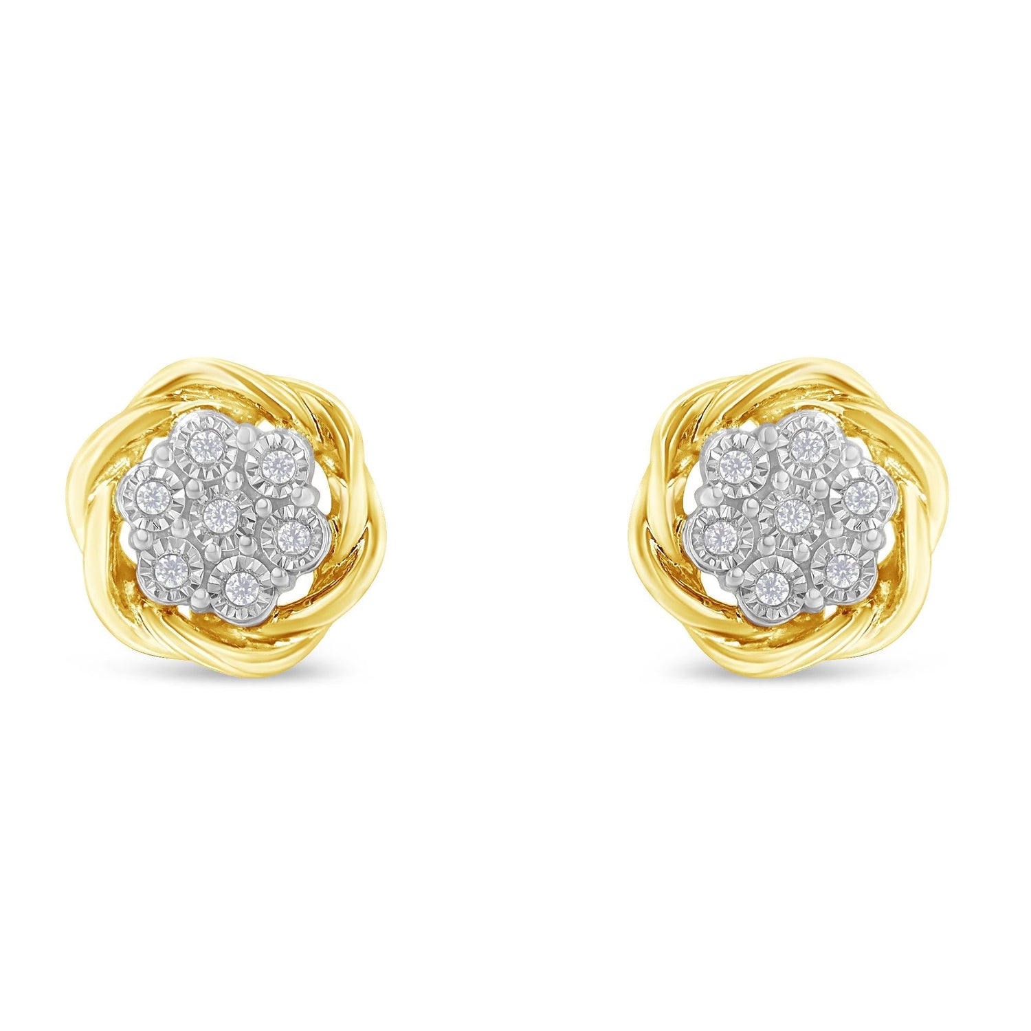 These Yellow Gold Plated Sterling Silver Diamond Rose Stud Earrings by Haus of Brilliance feature a beautiful rose accent design. Crafted from .925 sterling silver and plated with yellow gold, these earrings are adorned with 14 round-cut diamonds arranged in a miracle setting. Ideal for special occasions or everyday wear, these studs will complement any look.