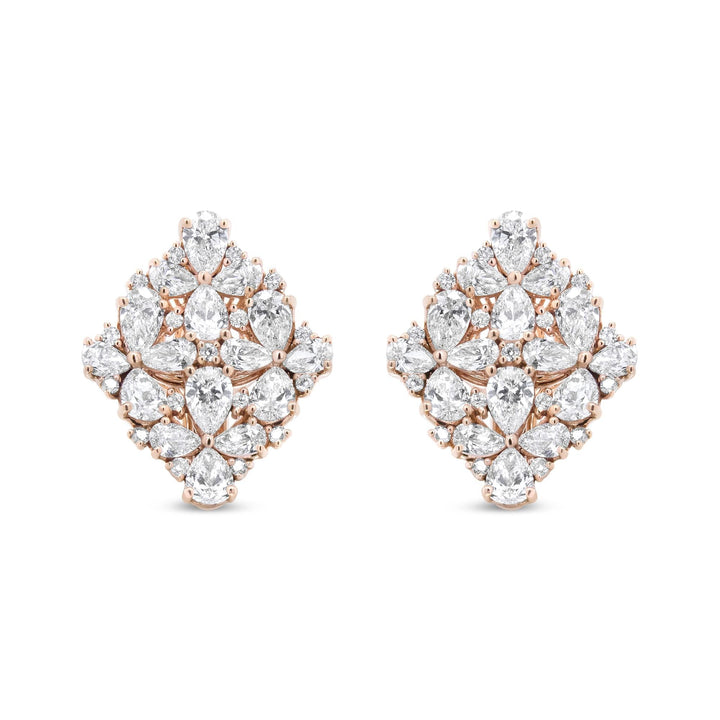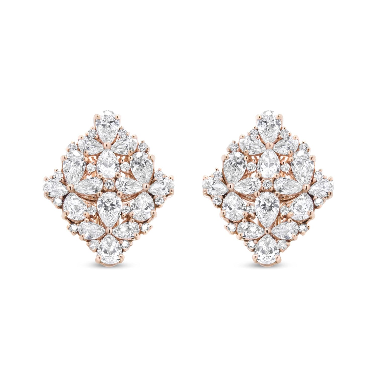 Crafted in 18K rose gold with 8 1/3 Cttw of F-G color, VS1-VS2 clarity round and pear-shaped diamonds. Omega clip-on findings.