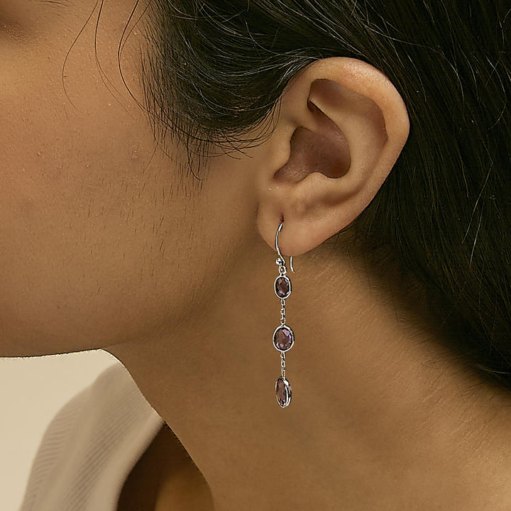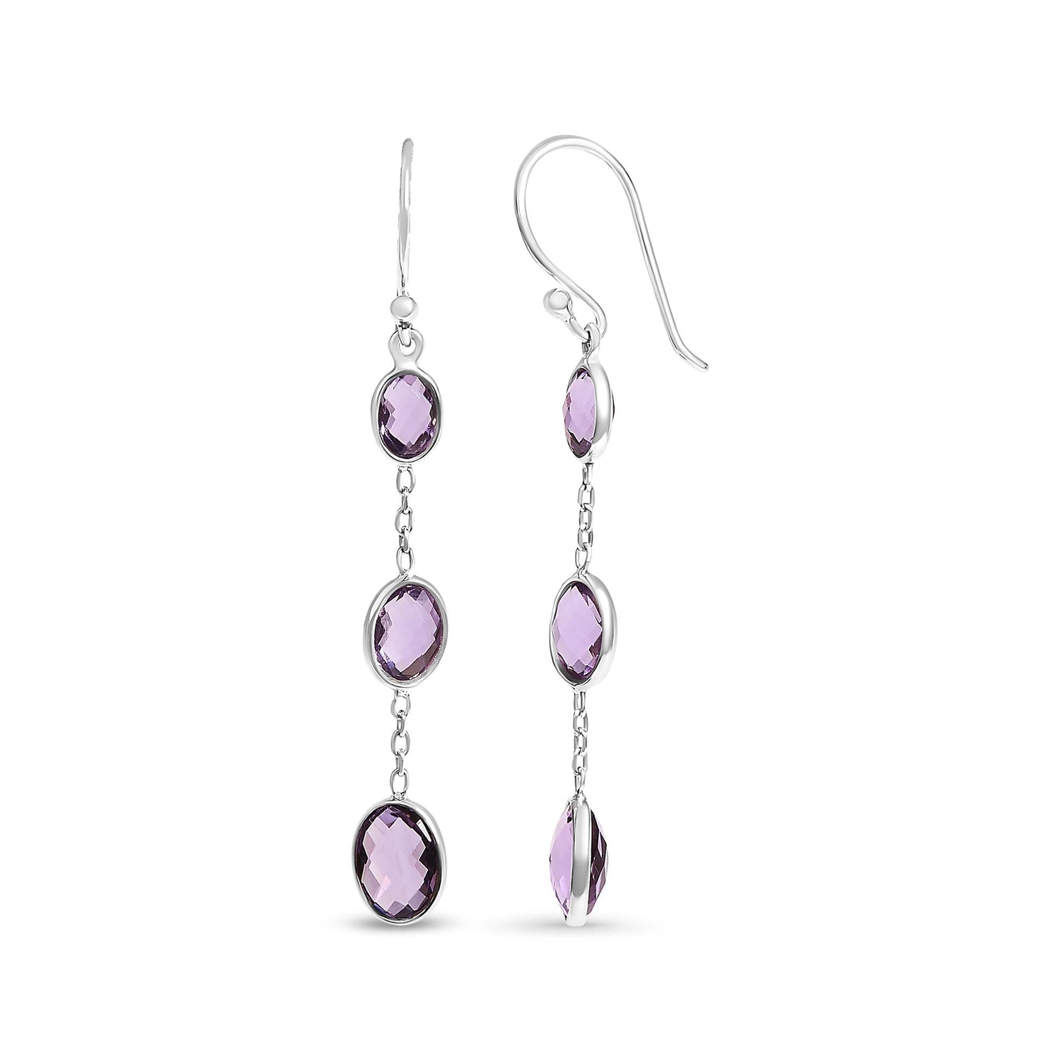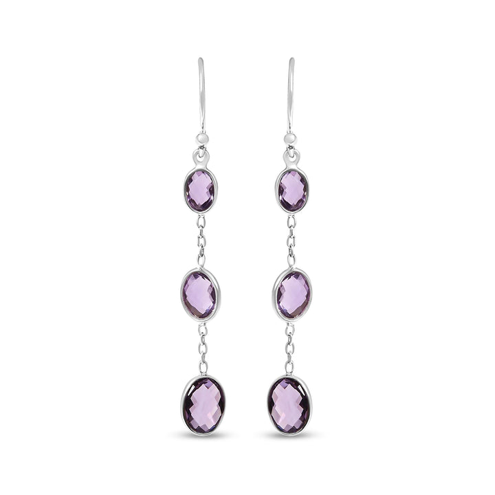 Crafted in rhodium-plated .925 sterling silver, featuring natural purple amethysts with checkerboard cuts. Bezel settings for secure placement. 2-inch drop length.